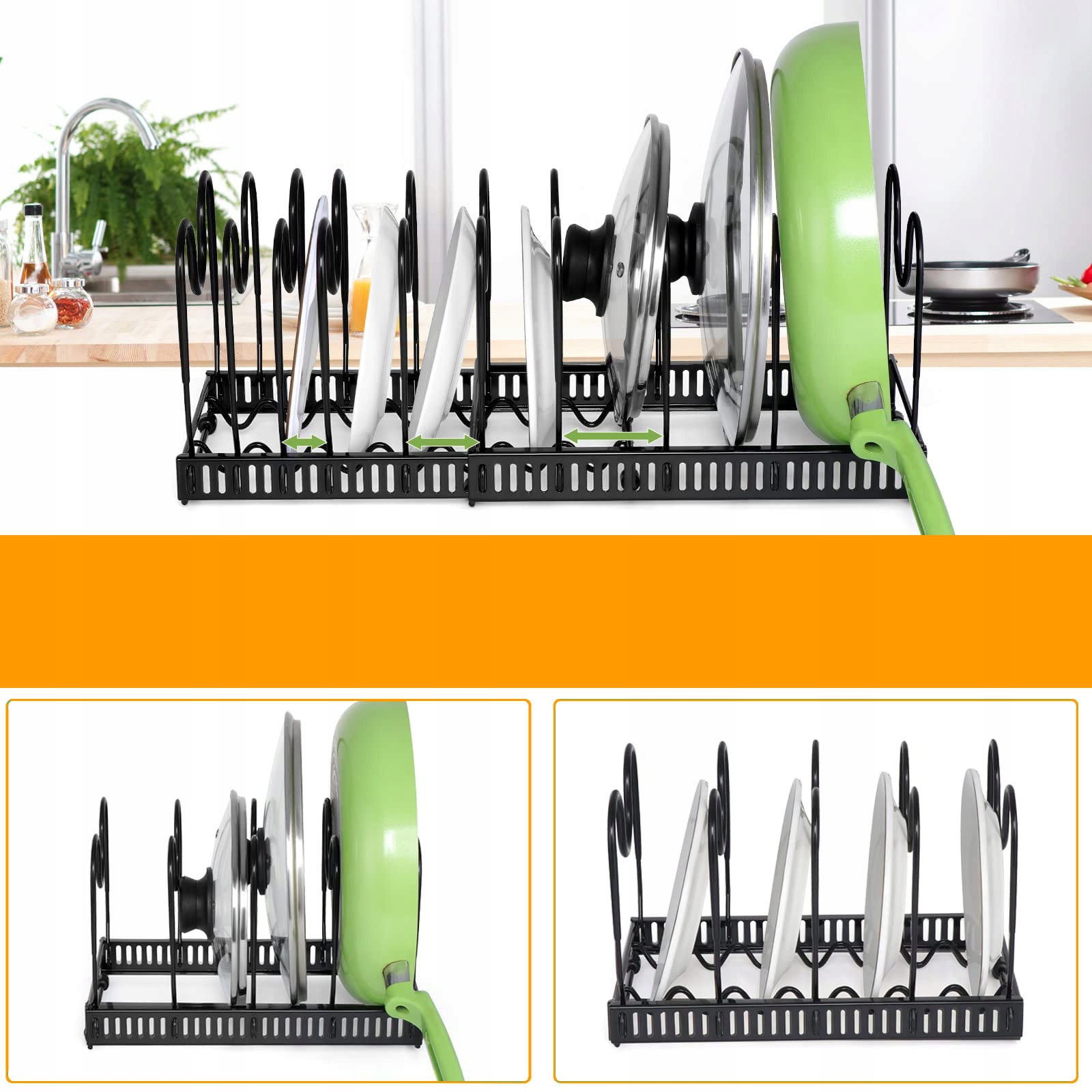 Наш розширювальний органайзер легко зібрати. Ви можете зібрати його за лічені хвилини без інструментів. Його можна використовувати як окремий регульований тримач кришки для каструль, а також можна розділити на два незалежних органайзера для каструль для окремого використання, щоб краще адаптуватись до простору вашої кухні.
