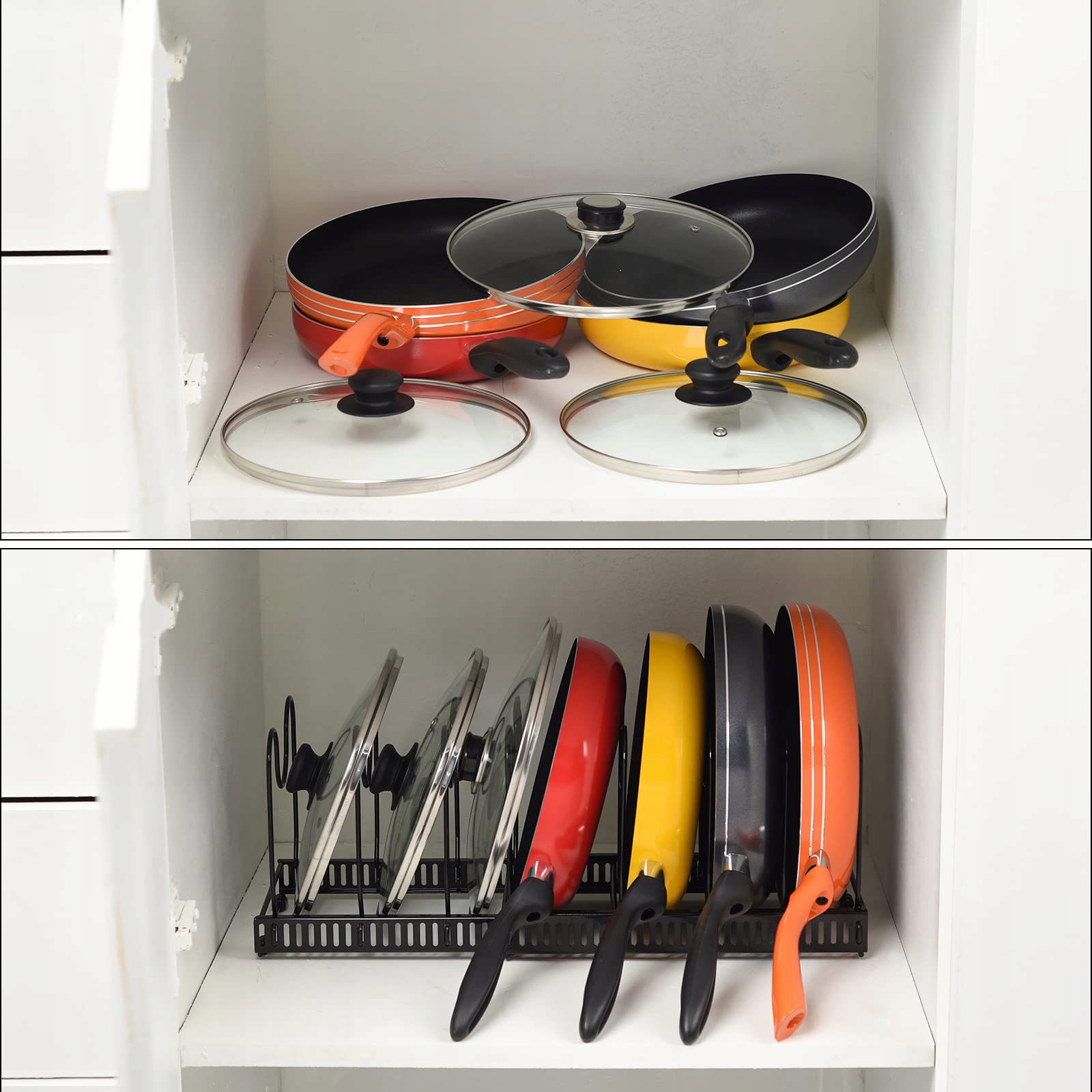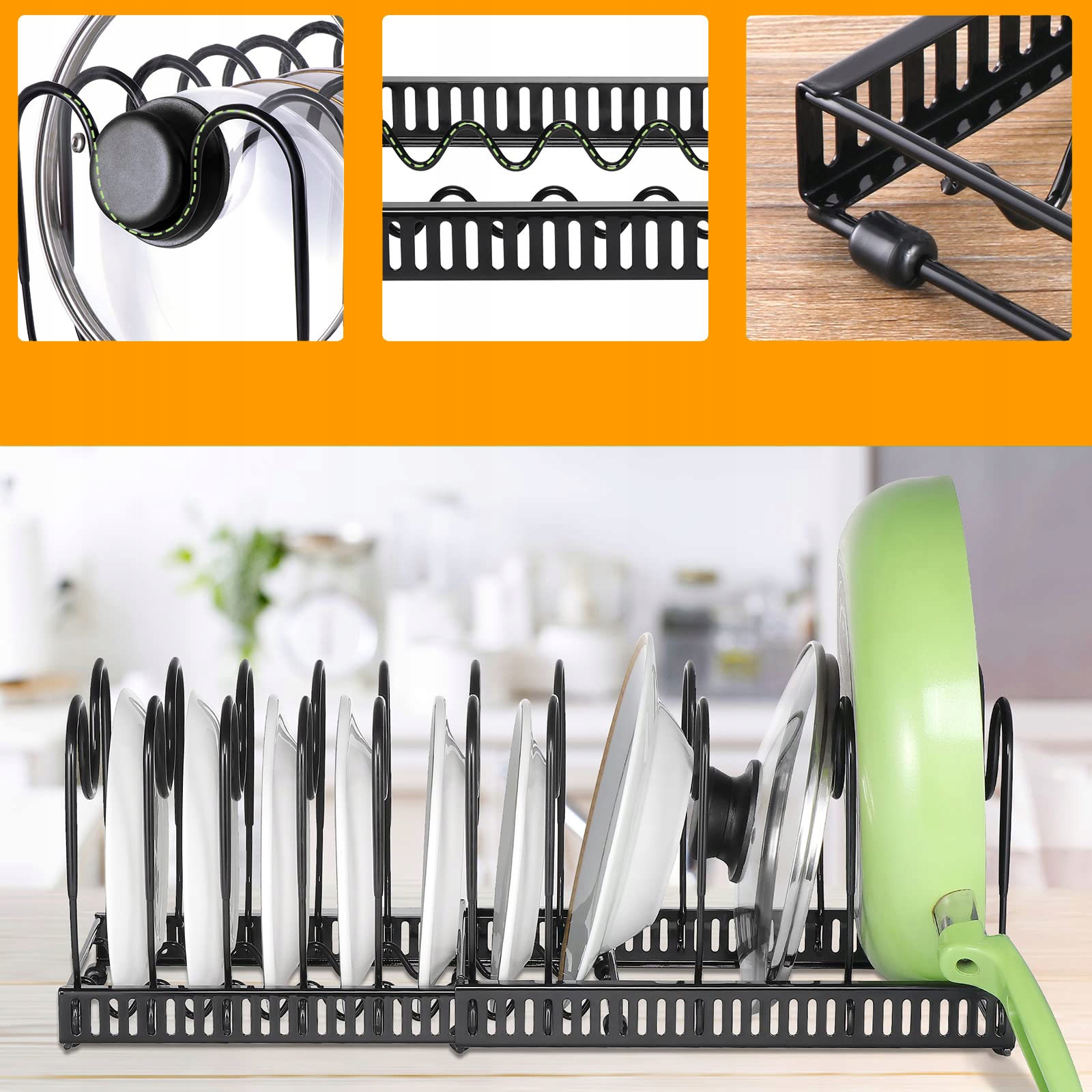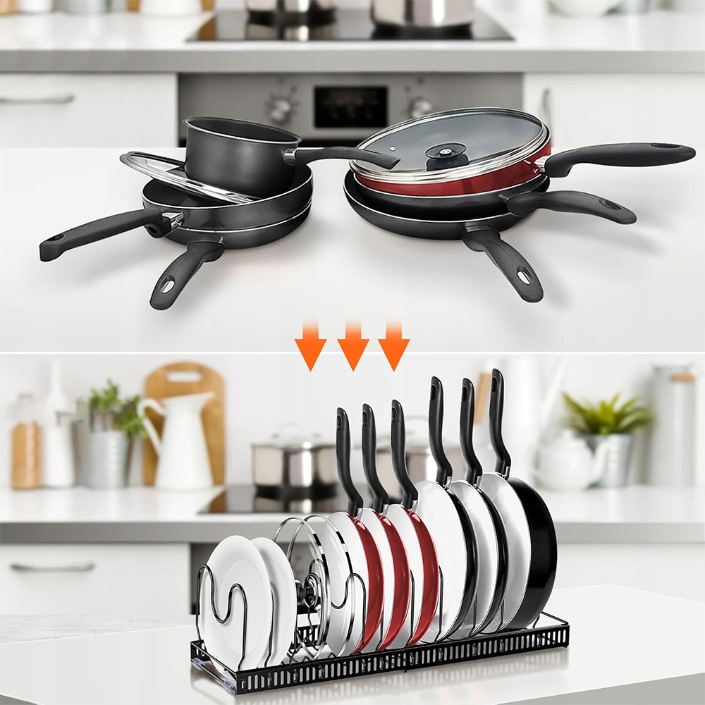 Він підходить не лише для тарілок, обробних дощок і кришок, але й для каструль і сковорідок. Ви можете легко розмістити цю підставку для столових приборів у шафах і ящиках, не займаючи місця на кухні. Отримайте додатковий простір для зберігання горщиків у шафах, коморі, шафі, під раковиною чи стільницею.
