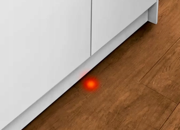 На роботу посудомийної машини вказує червоний промінь світла, що випромінюється на підлогу, коли пристрій працює. Після закінчення програми світло автоматично вимикається. Завдяки цьому вам не доведеться відкривати дверцята пристрою, щоб перевірити, чи закінчила роботу посудомийна машина.