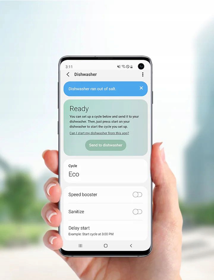 Мийте посуд, де б ви не були! Додаток SmartThings* дозволяє дистанційно контролювати та контролювати вашу посудомийну машину з будь-якого місця та в будь-який час за допомогою смартфона. Ви можете легко перевірити його стан, увімкнути або вимкнути, отримати рекомендації щодо циклу, вибрати програми та параметри та отримати діагностичну інформацію