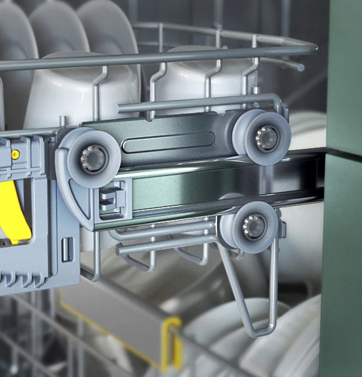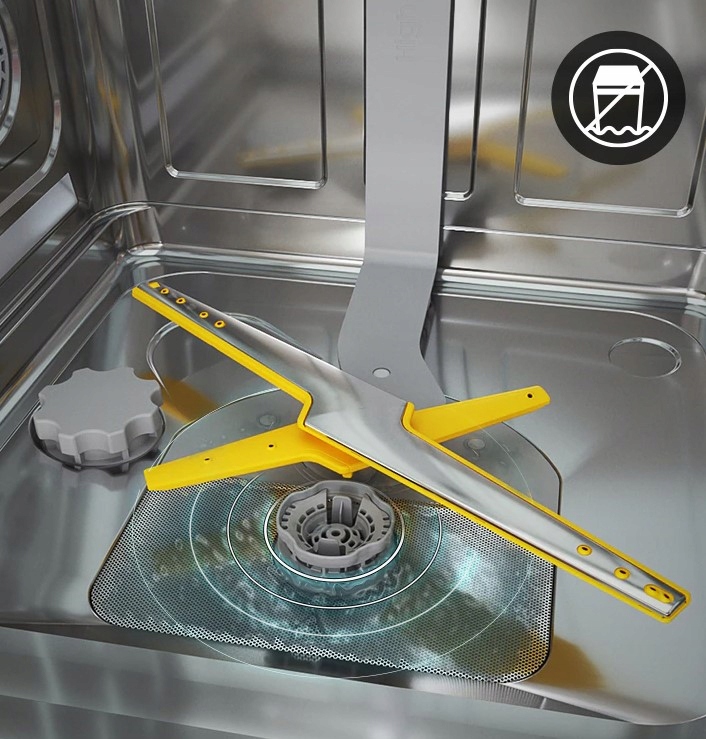 Кращі результати миття за допомогою WaterJet Clean™. Нова система обертових подвійних насадок дозволяє ще ретельніше мити та досягати навіть важкодоступних частин посуду. Два плеча з окремим потоком води, що обертається в різні боки, дозволяють дістатися навіть до важкодоступних місць і видалити навіть сильний бруд із посудин незвичайної форми.