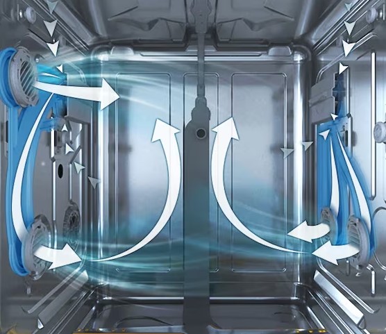 Ефективна сушка посуду з додатковою економією. Два вентилятори, вбудовані всередину посудомийної машини, підтримують циркуляцію повітря в посудомийній машині під час сушіння. Це рішення значно підтримує процес сушіння та дозволяє полоскати без необхідності підвищення температури, завдяки чому ми можемо зменшити споживання енергії до 10% *.