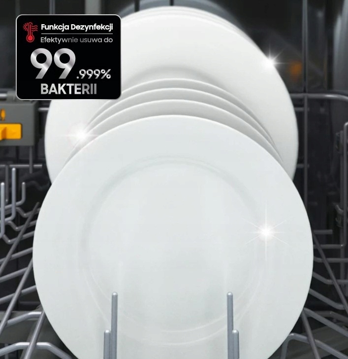 За допомогою функції дезінфекції ви можете ефективно очищати, зокрема: дитяча пляшечка або чашка. Вода в приладі нагрівається до 70°C, що дозволяє ефективно знищувати бактерії та віруси, які могли оселитися на посуді. Видаляє 99,999% бактерій і мікробів, роблячи вимитий посуд ідеально чистим.*
