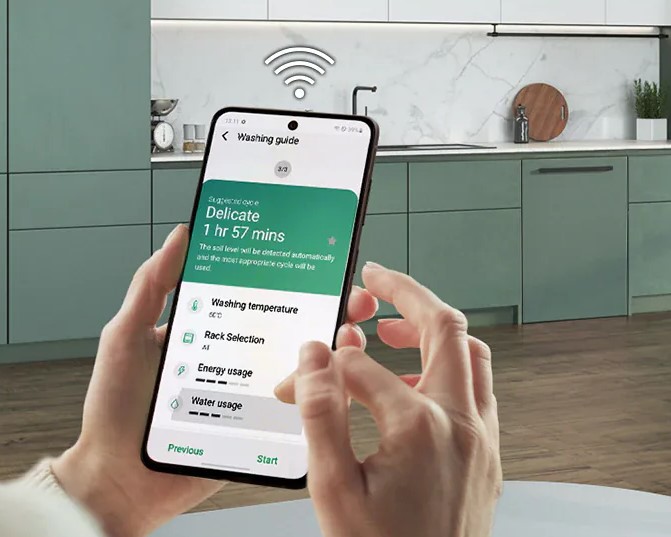Оптимізуйте використання посудомийної машини відповідно до ваших потреб. Додаток SmartThings* дозволяє швидко дистанційно контролювати пристрій і керувати налаштуваннями зі смартфона. Підказує, яку програму краще вибрати, обмежує та контролює енергоспоживання, а також дозволяє переглядати діагностику пристрою, включаючи перевірку будь-яких помилок. *Програма SmartThings доступна на пристроях з операційними системами Android та iOS (ОС Android 8↑, iOS 13↑). Потрібне з’єднання Wi-Fi та обліковий запис Samsung. Усі керовані пристрої мають бути зареєстровані в програмі SmartThings.