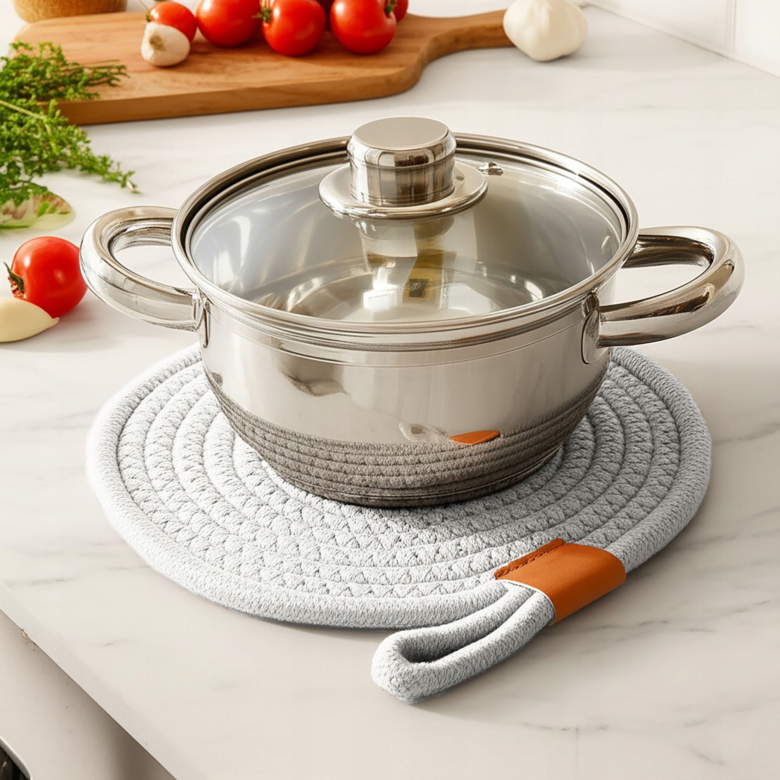Ця кругла підставка є ідеальним рішенням, яке поєднує в собі практичність і природний дизайн. Виготовлений із плетеної бавовни, він ефективно захищає стільниці та столи від гарячого посуду, наприклад каструль і сковорідок. Завдяки універсальному, мінімалістичному вигляду з елегантною ручкою з екошкіри, це також вишуканий декоративний елемент, який пасує до будь-якої кухні та їдальні.