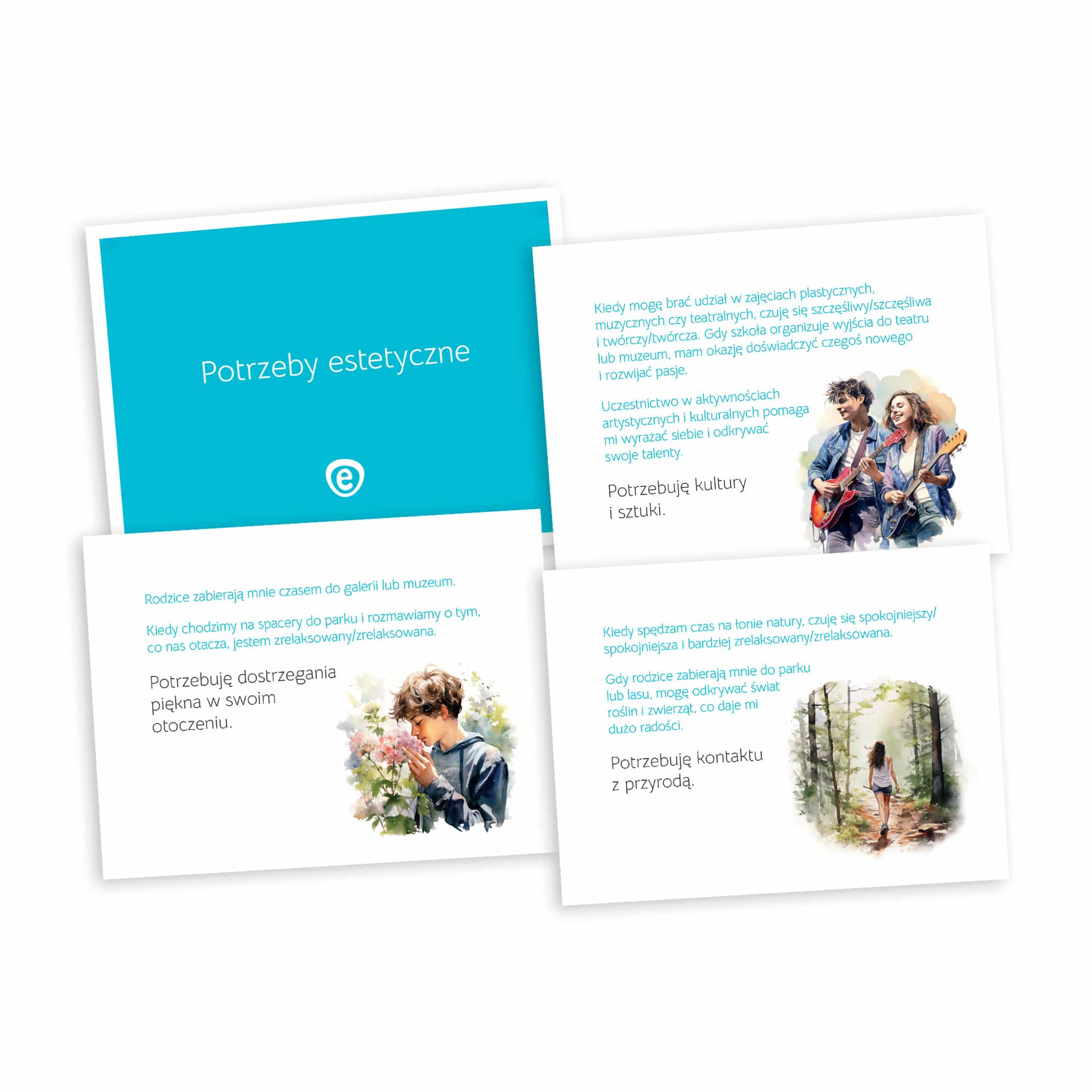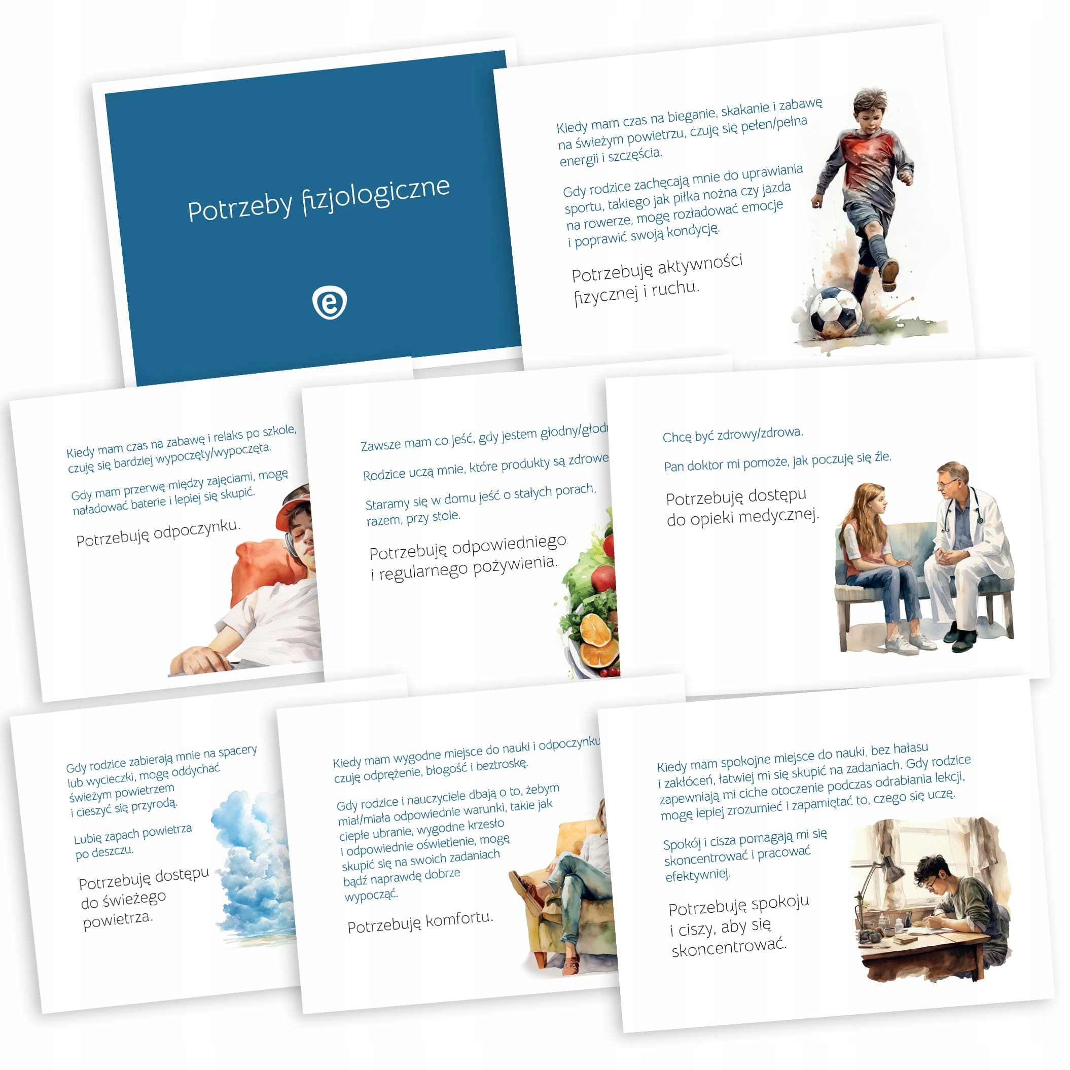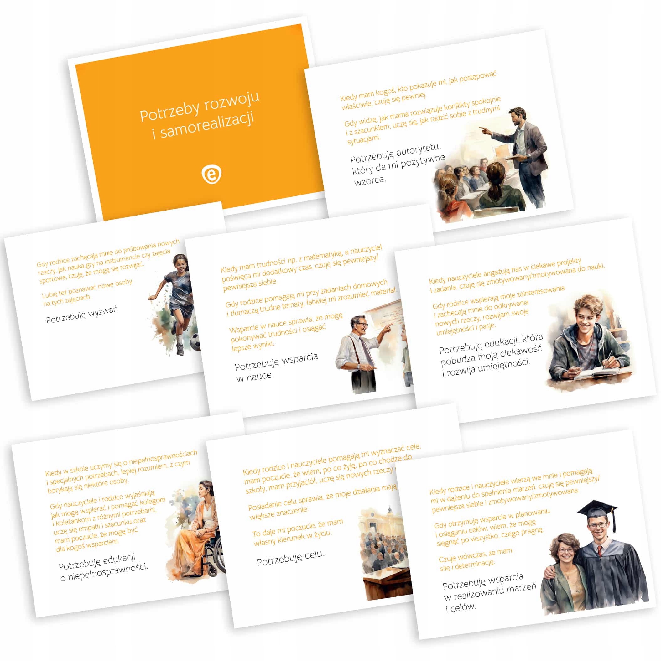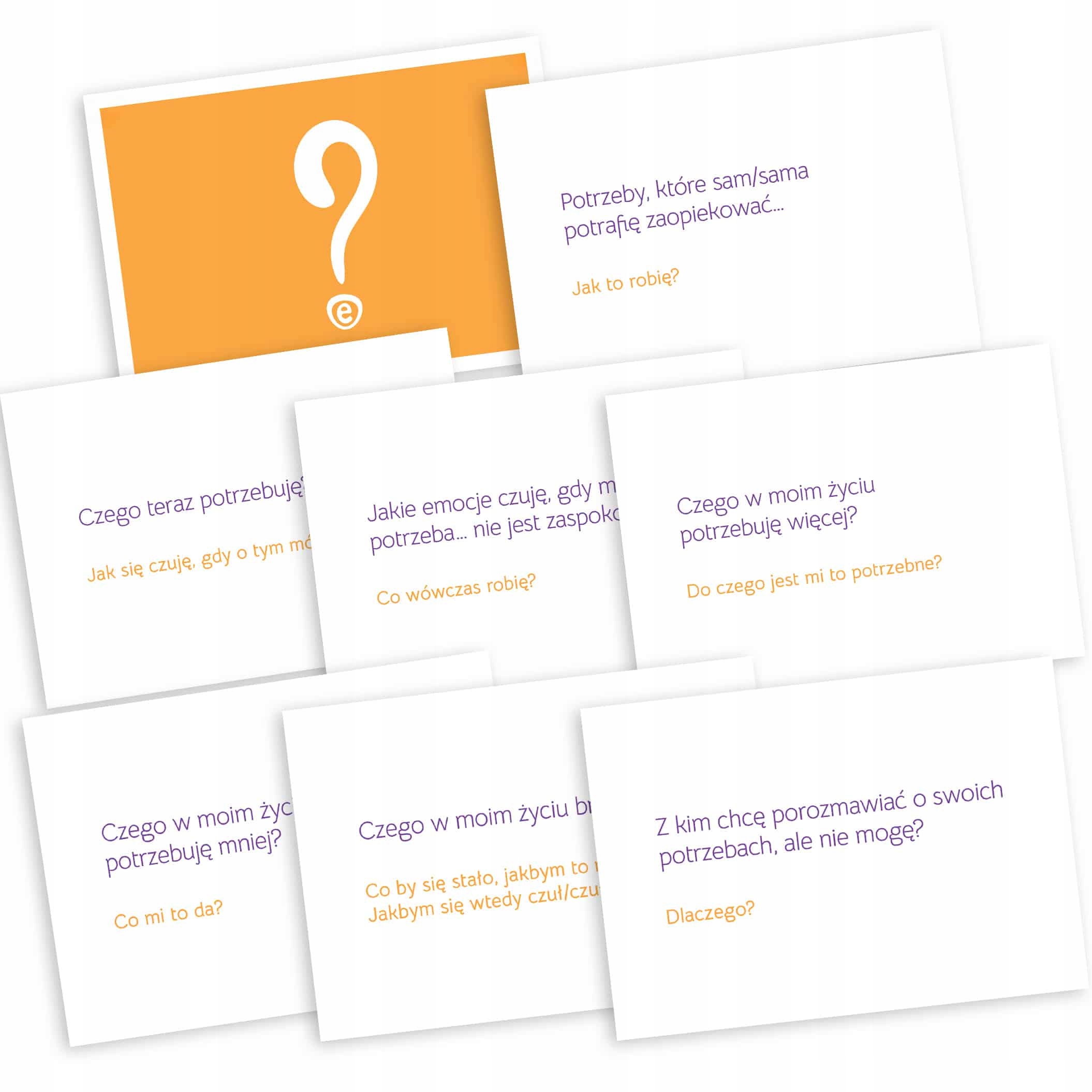 потреби приналежності та любові: міжособистісні відносини, емоційні зв’язки та підтримка; потреби розвитку та само -реалізації: особистий розвиток, творчість та досягнення цілей; Необхідність визнати та поважати: вдячність, визнання досягнень та самоповільнення; емоційні потреби: розуміння, вираження та регулювання емоцій; Духовні потреби: пошук сенсу, цінностей та переконань; естетичні потреби: чутливість до краси та гармонії в навколишньому середовищі; соціальні потреби: соціальні взаємодії та здатність до співпраці; 4 30 карт із допоміжними питаннями забезпечення глибшого розуміння та роздумів про потреби: