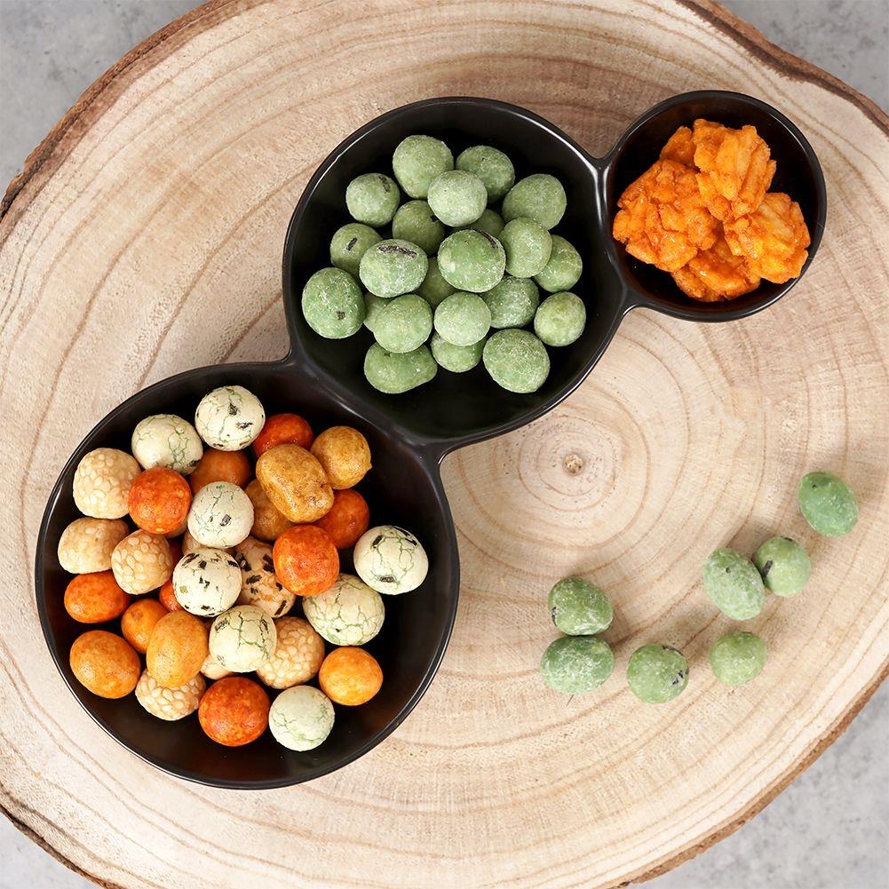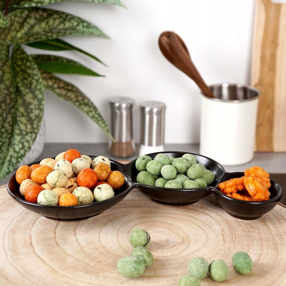 Розділена на три менші миски. Чаша міцно виготовлена з найякіснішої порцеляни, тому це також чудова ідея для подарунка. Надзвичайно корисна в повсякденному житті використання, а й під час зустрічей. У ньому можна подавати солоні закуски, солодощі або соуси. Чорна порцеляна красиво виглядає на столі та є декоративним елементом, який пасує до решти посуду.