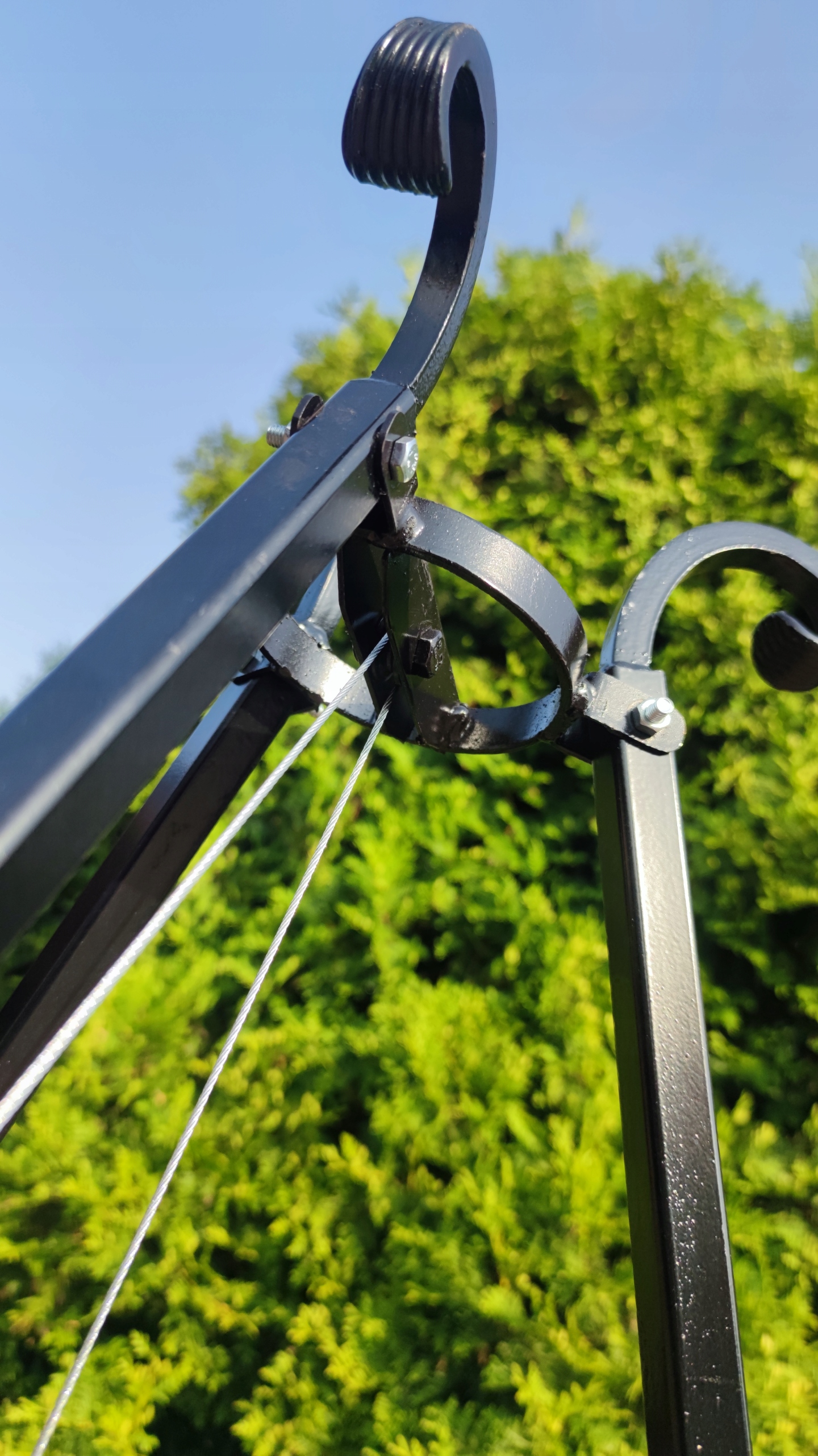 Решітка-тринога з профілю 2х2 см з товщиною стінки 2 мм. Висота 210 см, штатив з регульованою по висоті решіткою на кривошипі, з ланцюгом і хорошою мотузкою. Порошкове покриття під температурою 400 градусів у чорний колір.