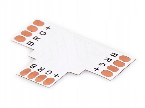 Т-подібний Т-роз'єм, призначений для різнокольорових світлодіодних стрічок RGB шириною 10 мм. Т-коннектор має мідні доріжки з трьох сторін, що дозволить швидко паяти світлодіодні стрічки. Т-подібний роз’єм для світлодіодних стрічок дозволить надійно та довго з’єднати три світлодіодні секції. Коннектор, доступний у нашій пропозиції, призначений для світлодіодних стрічок шириною 10 мм, тобто найчастіше вибираються світлодіодні стрічки RGB з діодами SMD 5050, які можна використовувати як для звичайної світлодіодної стрічки, так і для водонепроникної у цьому випадку його силіконову кришку необхідно зняти заздалегідь.