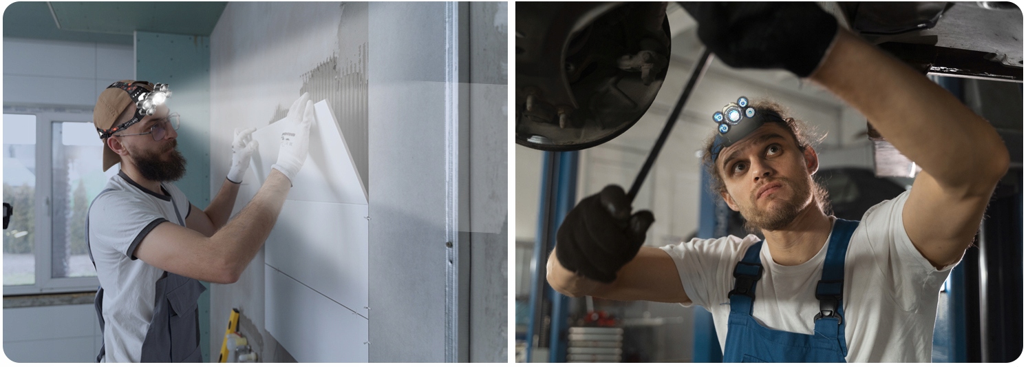 Налобний ліхтар - незамінний робочий інструмент для людей, які працюють у темряві. Механіки, будівельники, електрики тощо використовувати «налобні ліхтарі» » завдяки зручності роботи. Вони дозволяють освітлювати робоче місце, не відриваючи рук, що суттєво позначається на комфорті виконуваної діяльності, що безпосередньо впливає на результат роботи! Ці типи ліхтариків також є дуже корисним гаджетом для спортсменів, які часто тренуються в темряві! Коли ліхтарик увімкнено, загоряється червоний світлодіод на задній панелі, тому незалежно від того, їдете ви на велосипеді чи бігаєте, вас буде видно в темряві під час щоденного тренування!