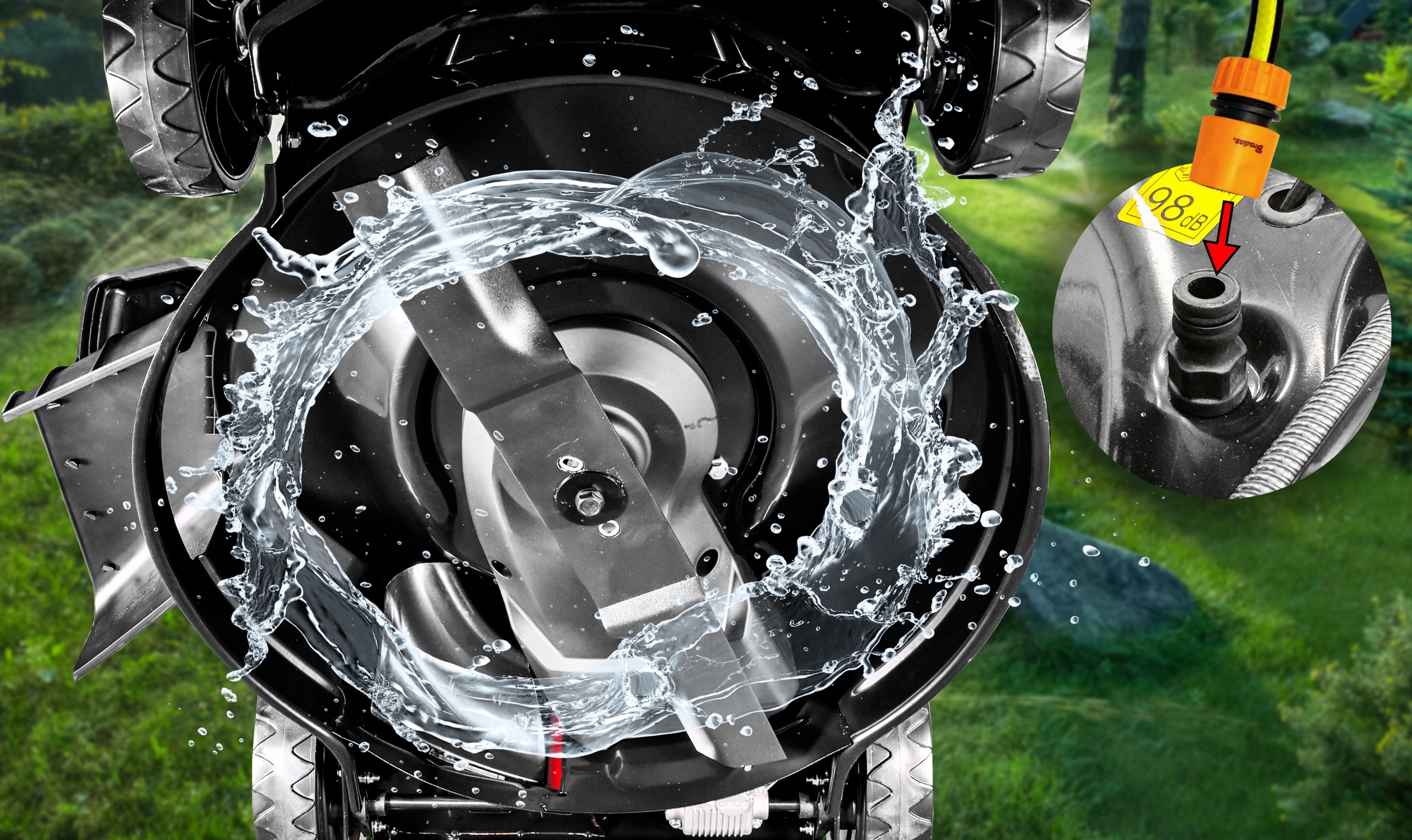 Наша газонокосарка оснащена інноваційним з’єднувачем для шланга, який забезпечує швидке та зручне очищення корпусу. Це рішення, яке відрізняє нас від конкурентів тим, що дозволяє легко підтримувати обладнання в чистоті та в ідеальному стані. Завдяки використанню новітніх технологій наші косарки не тільки більш функціональні, але й довговічніші та прості у використанні, ніж будь-які інші, доступні на ринку. Інвестуйте в обладнання, яке поєднує в собі сучасність, комфорт і надійність!