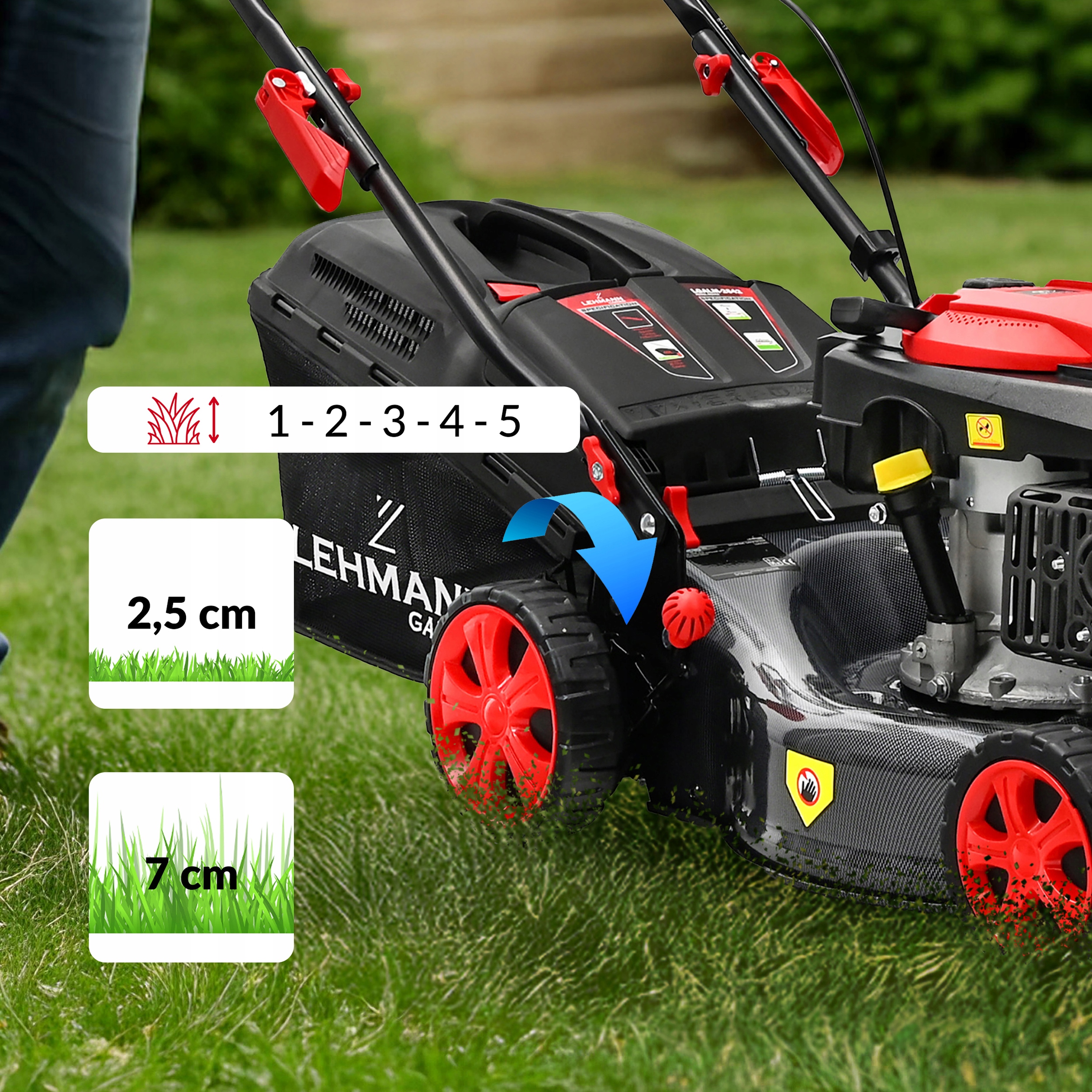 - Регулювання висоти зрізу 25-70 мм - Ви можете ідеально налаштувати висоту зрізу відповідно до умов газону, піклуючись про його зовнішній вигляд і здоров'я.