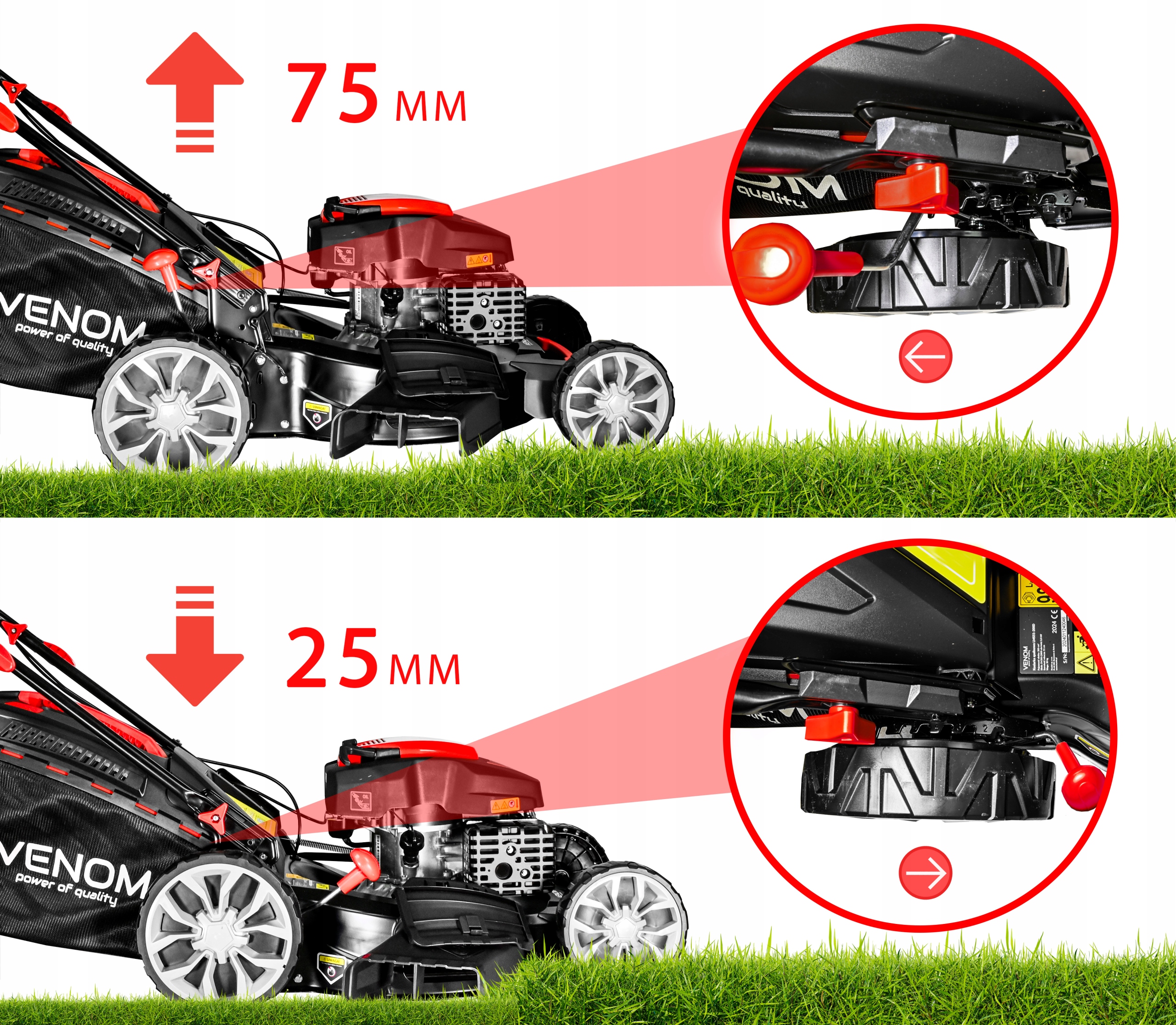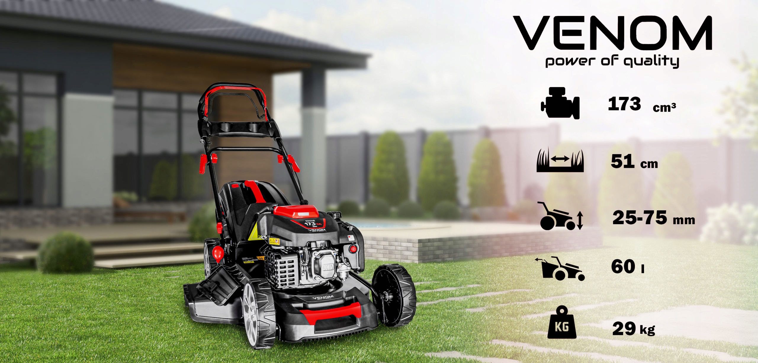 Внутрішня косарка згоряння Venom проста у використанні та ефективності. З його допомогою скошіння великі площі не будуть головною проблемою! Ротаційна робота пропонує точність, і, таким чином, - висока естетика, а також адекватна допомога на газон.