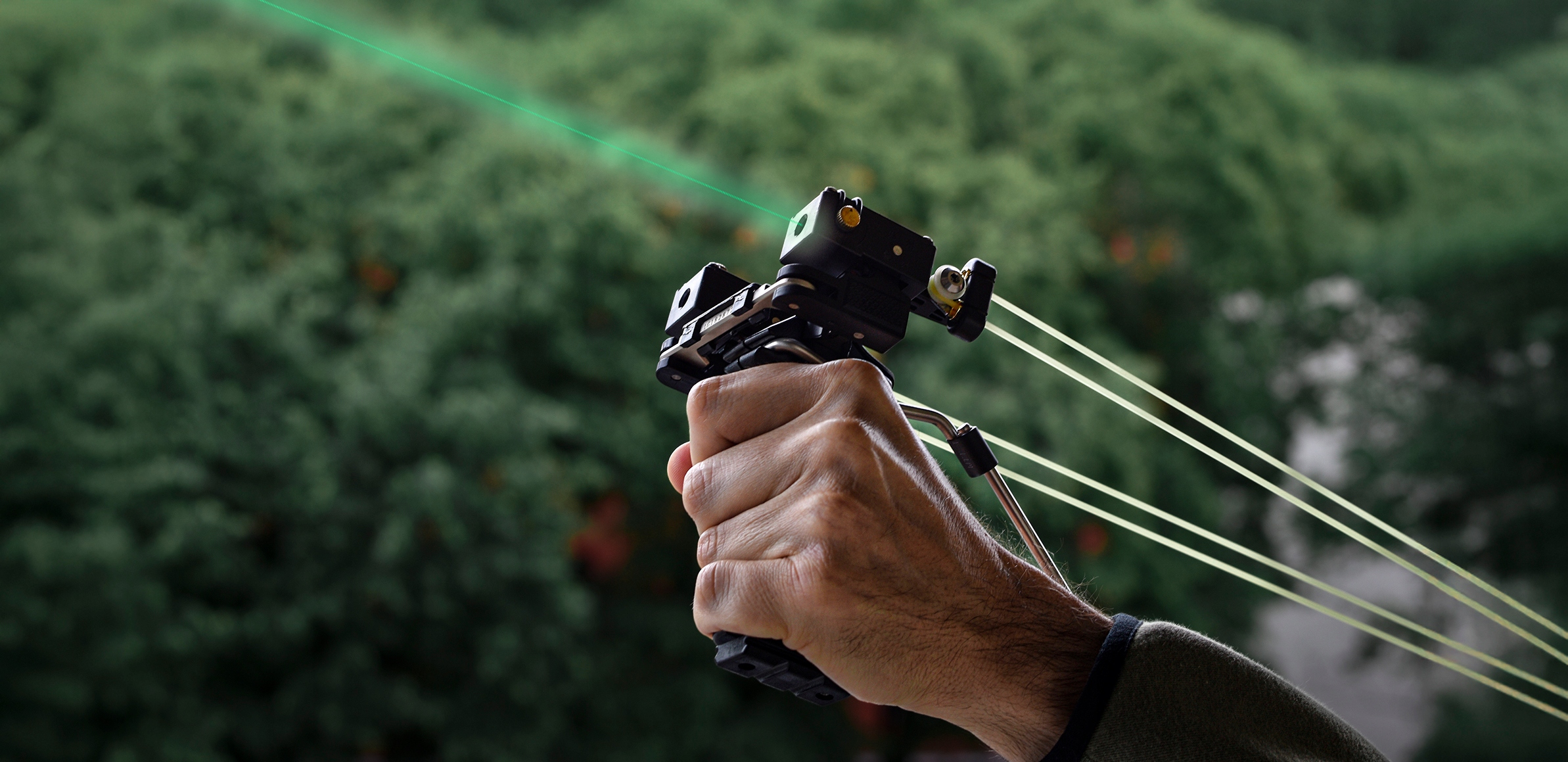 - Дві зелені лазерні приціли, встановлені у верхній частині рогатки, коли приціли увімкнено, один, але завдяки комутаторі, розміщеному на ручці, ми можемо швидко визначити, з якого прицілу (правого або лівого) ми хочемо використовувати в даний час, приціли додатково регулюються у вертикалі та горизонталі через гвинт у верхній частині. Вони живляться від 2x батареї AAA (невеликі пальці), додані до набору, які розміщуються в ручці ролики знизу. 4