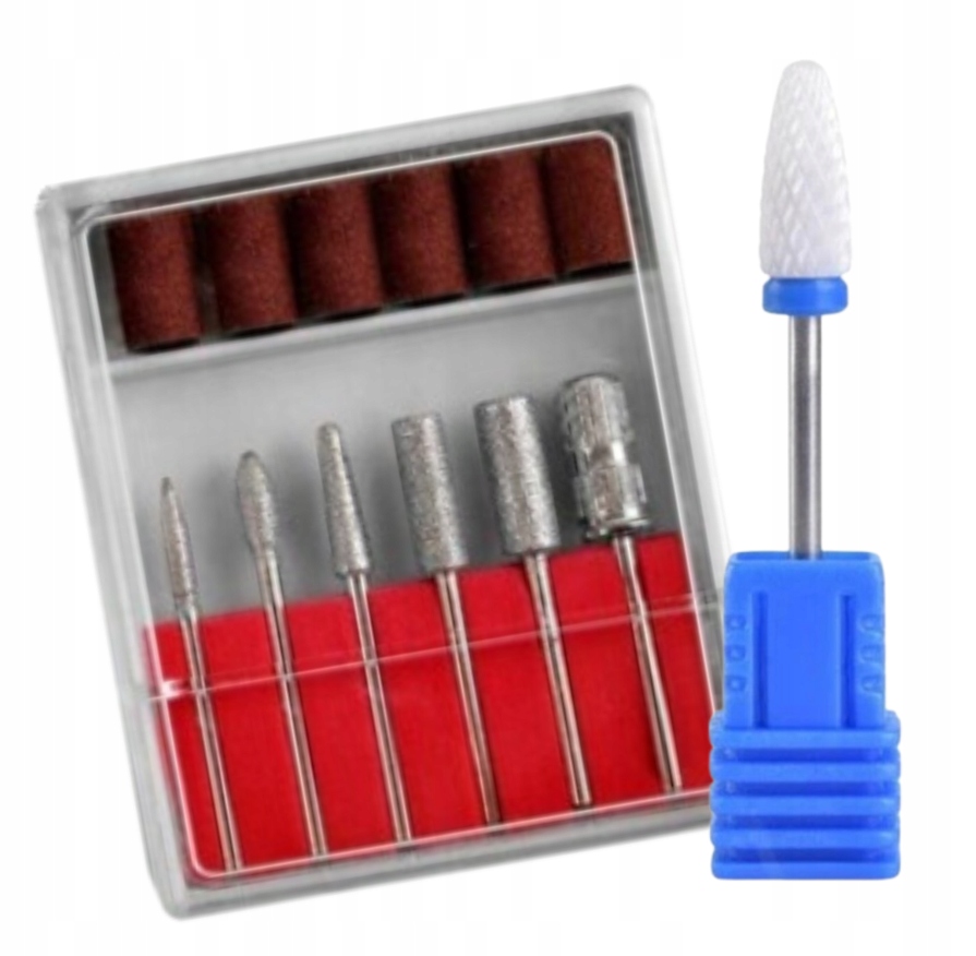Професійний набір із 5 алмазних фрез із тримачем. Фрези ідеально підходять для підпилювання гелевої та акрилової маси, видалення кутикул навколо нігтьової складки, а також для педикюру.