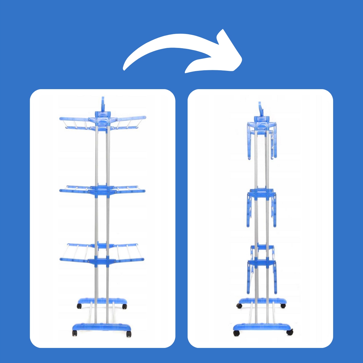Як ми писали раніше, сушильна машина має 3 рівні. Однак їх можна скласти, і сушарка практично не займає місця. Завдяки такому рішенню ви можете практично забути про невикористану сушарку. Сама сушильна машина для білизни, завдяки згаданим вище перевагам, є майже в понад 3 рази ефективнішою за звичайні сушарки.