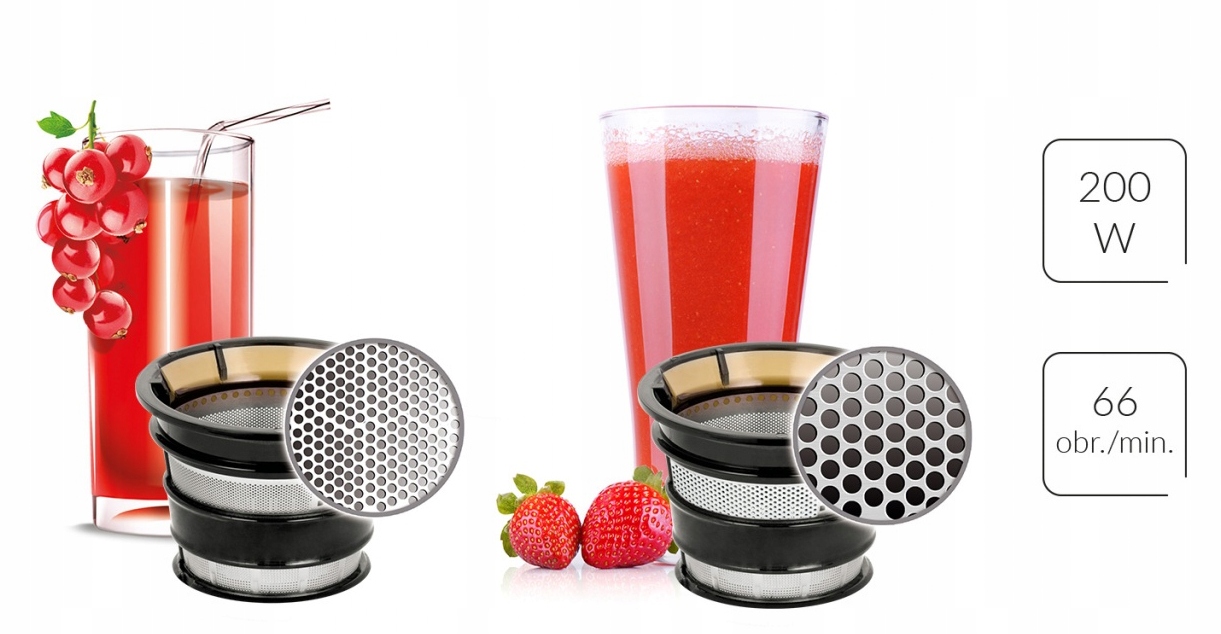 - два сітчастих фільтри з нержавіючої сталі для соків: прозорий (маленькі отвори) і товстий (великі отвори)