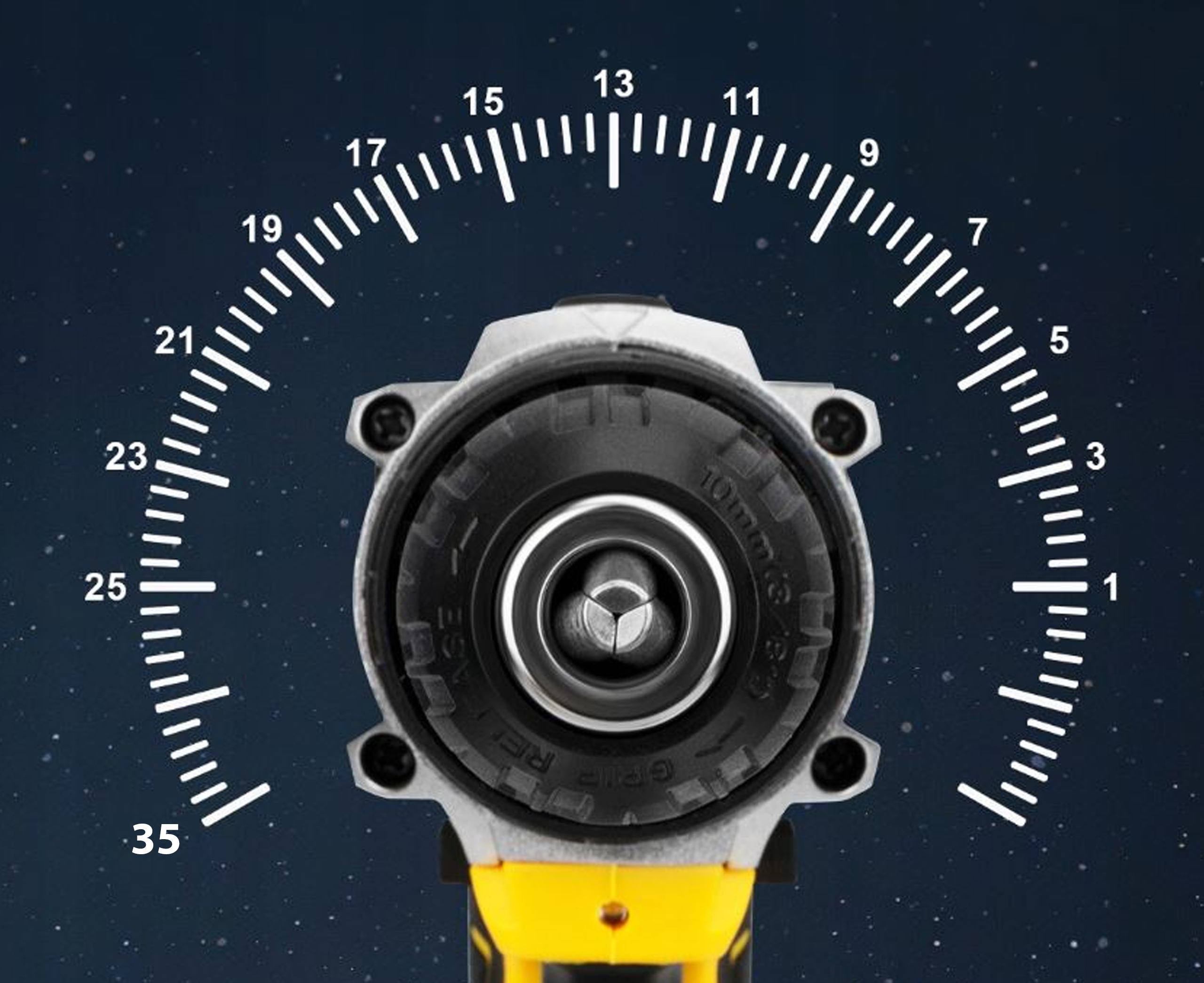 - Точне регулювання: Завдяки 35-позиційному регуляторному кільці, користувач може точно відрегулювати крутний момент і швидкість, збільшуючи контроль та мінімізуючи ризик пошкодження.
