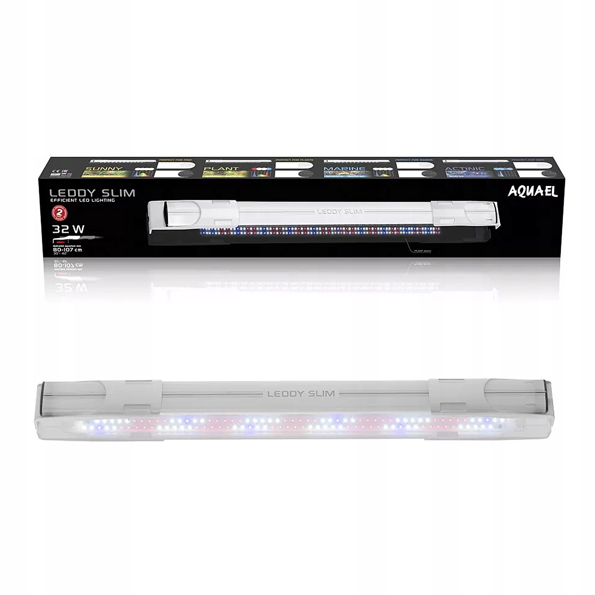 Світлодіодна лампа LEDDY SLIM 32W PLANT призначена для освітлення відкритих прісноводних рослинних резервуарів довжиною від 80 до 107 см. Містить ретельно підібрані світлодіоди, які забезпечують ідеальне освітлення акваріума, гарантуючи відмінні умови життя для його мешканців і унікальний візуальний ефект. Його плоска футуристична форма і модний білий колір ідеально вписуються в сучасні акваріуми і чудово виглядають в будь-якому інтер'єрі. Крім того, він універсальний - висувні кронштейни дозволяють встановлювати його і на баки нестандартних розмірів.