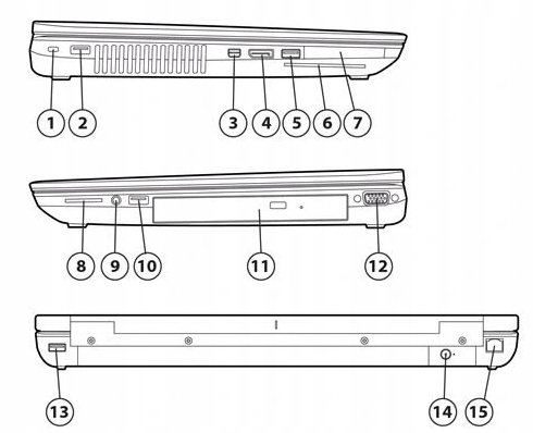 - Порти: 3x USB 3.0; USB 2.0; VGA; RJ-45 (Ethernet); 1x Audio (навушники, мікрофон); Кардрідер(SC і SD); DisplayPort;