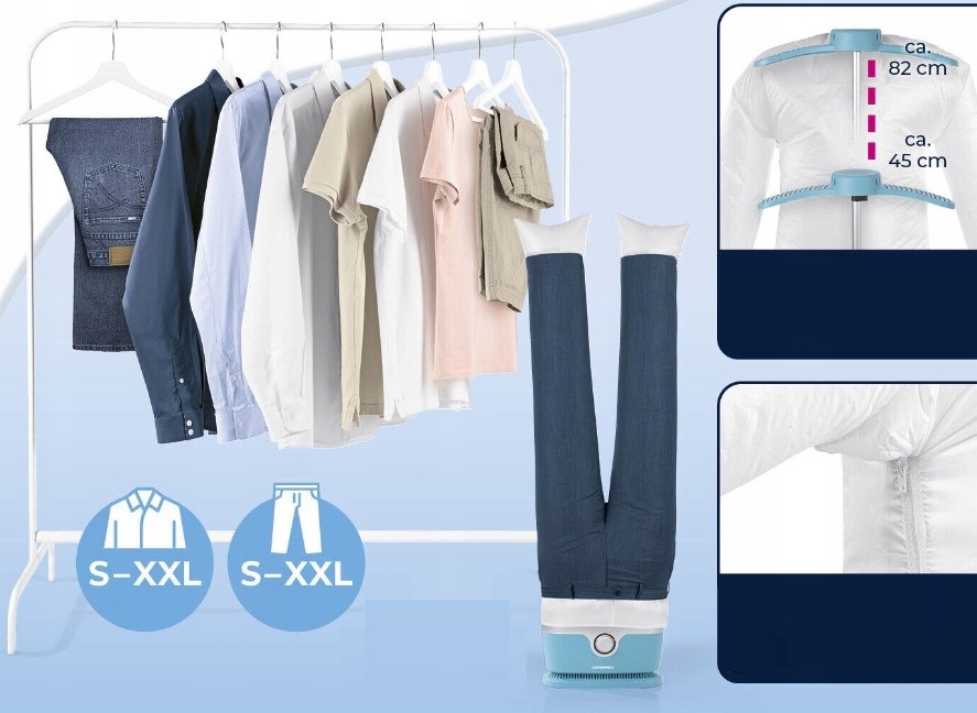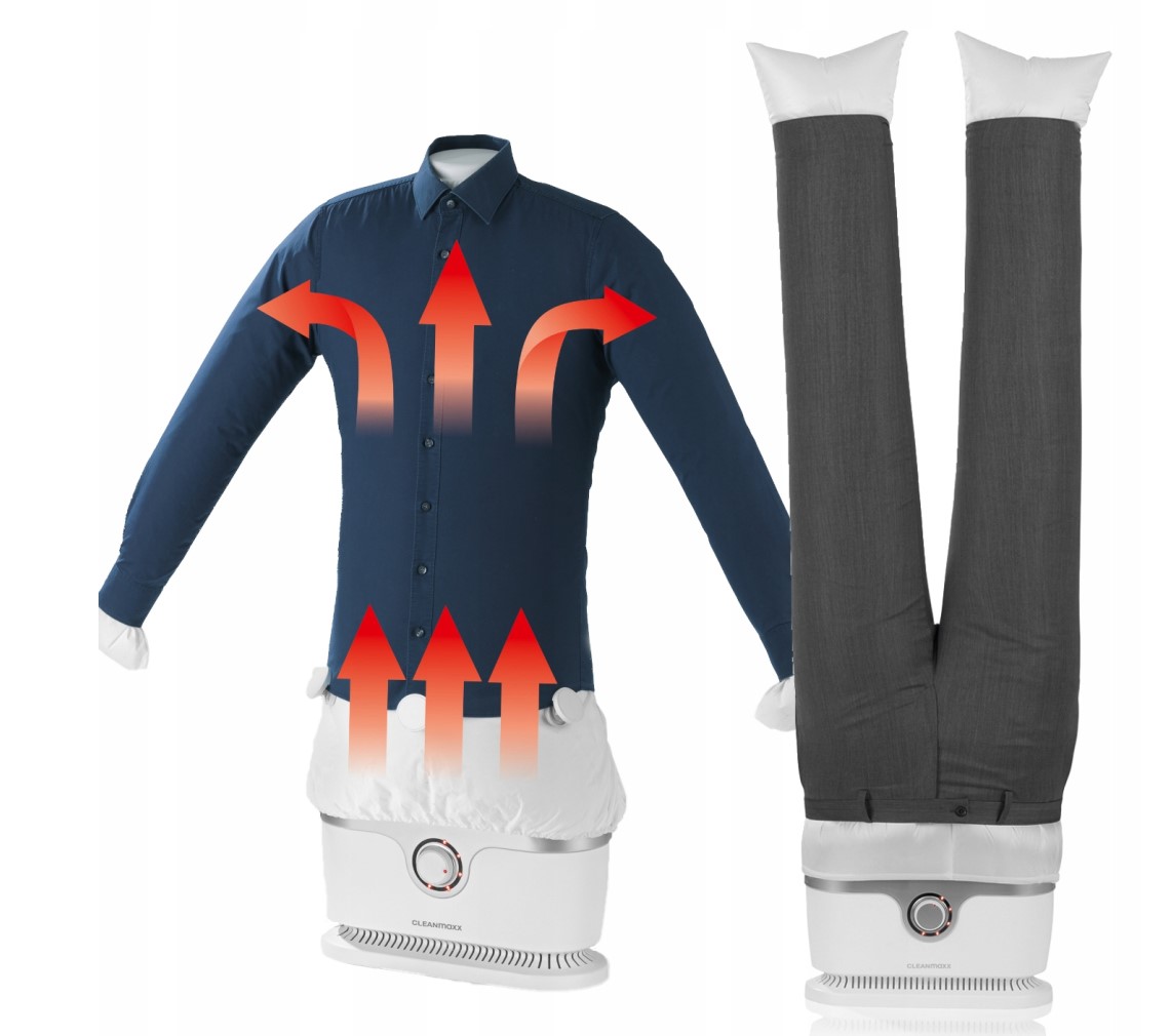 Установіть таймер на потрібний час. «Тіло і руки» надуваються і одночасно віддають тепло в сорочку, що сушиться. Вони висихають швидше і м'якше, ніж у сушильній машині, і відразу розправляють складку. Підходить для всіх тканин, придатних для сушіння.