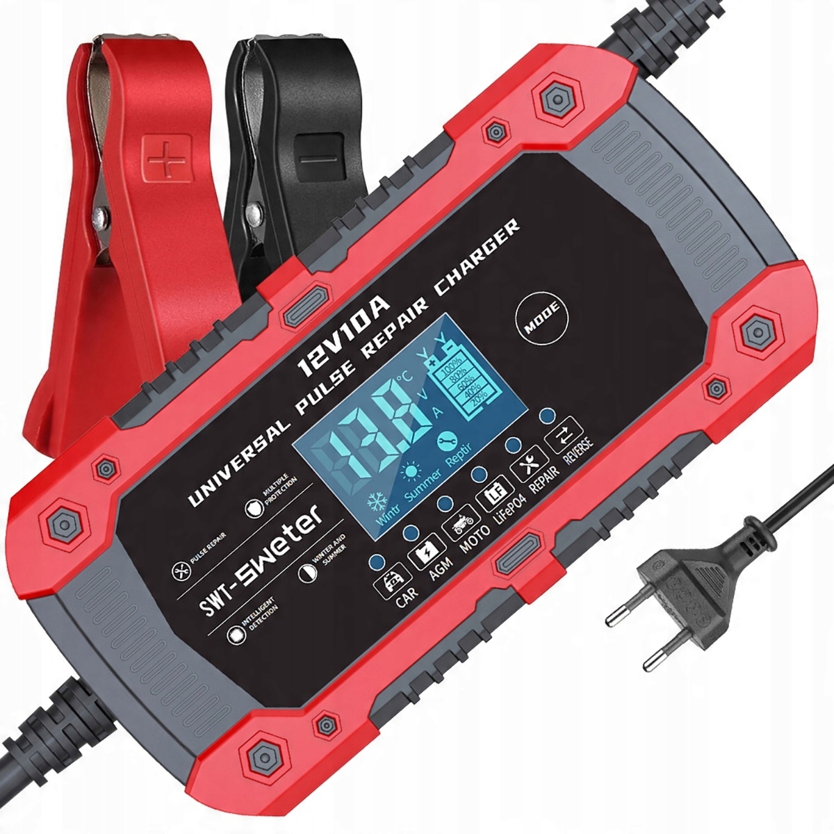 Автомобільний зарядний пристрій 10 A, розумний повністю автоматичний автомобільний зарядний пристрій 12 В, зарядний пристрій із температурною компенсацією та РК-дисплеєм для автомобілів, мотоциклів, вантажівок (червоний/чорний)
