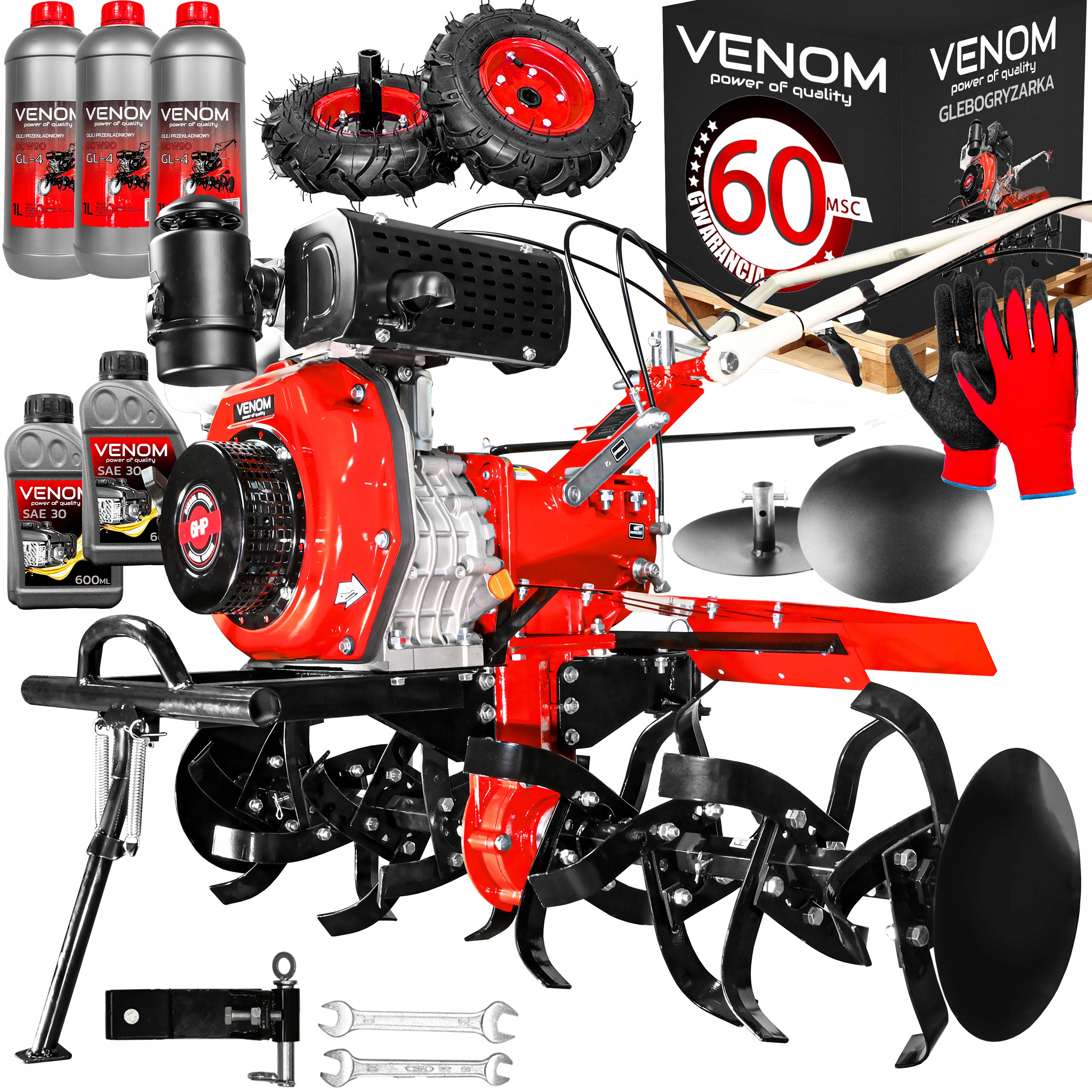 Універсальний та універсальний Тіллер, призначений для роботи в садах, пластикових тунелях, оранжихах та фермах, що виховують рослини. B> Зворотна передача, дві передачі вперед або коригування глибини робота, робить Venom дуже ефективним пристроєм з обробки. Підготовка або вирощування ґрунту стає легкою, швидкою та приємною. Пакет - PLN 699.00 Валовий