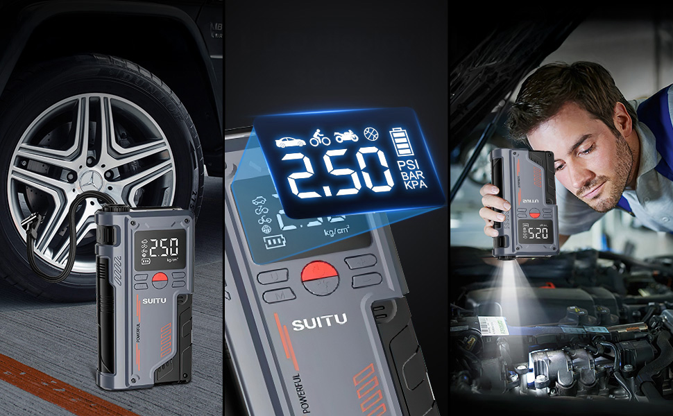 ✔️- Він має функцію накачування, яка дозволяє накачати стандартну автомобільну шину за лічені секунди та автоматично зупиняється, коли вона заповнена.