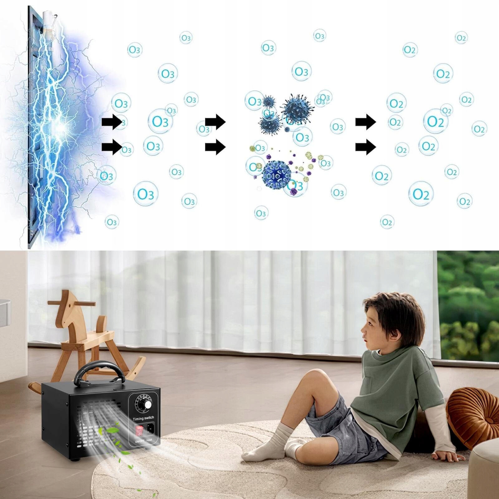 🌳【Ефективність】: Генератор озону використовує потужний вентилятор для швидкого розподілу озону в кімнаті, реагуючи із забруднювачами та швидко перетворюючи їх на свіжий кисень.