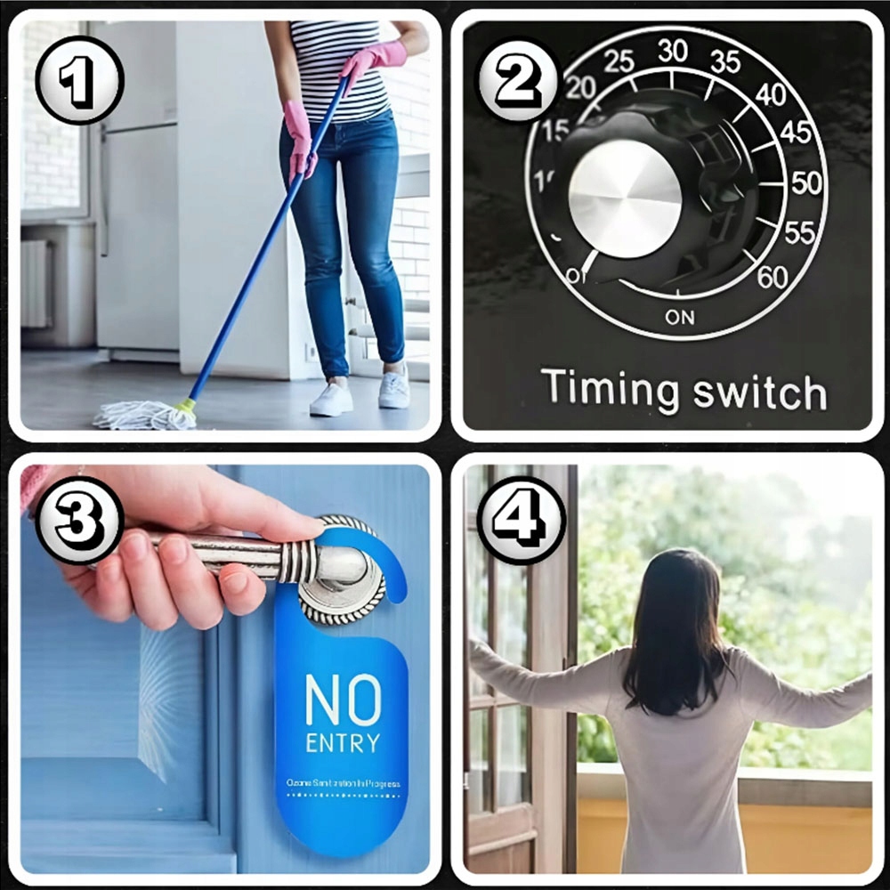 Пристрій для озонування має 60-хвилинний таймер для безпечнішого використання. Таймер може встановити час використання до 1 години. Час прибирання можна регулювати відповідно до розміру приміщення та інтенсивності запаху, який потрібно прибрати. Під час дезінфекції рекомендується залишити приміщення, оскільки під час роботи виділяється легкий запах. Однак це нормально.