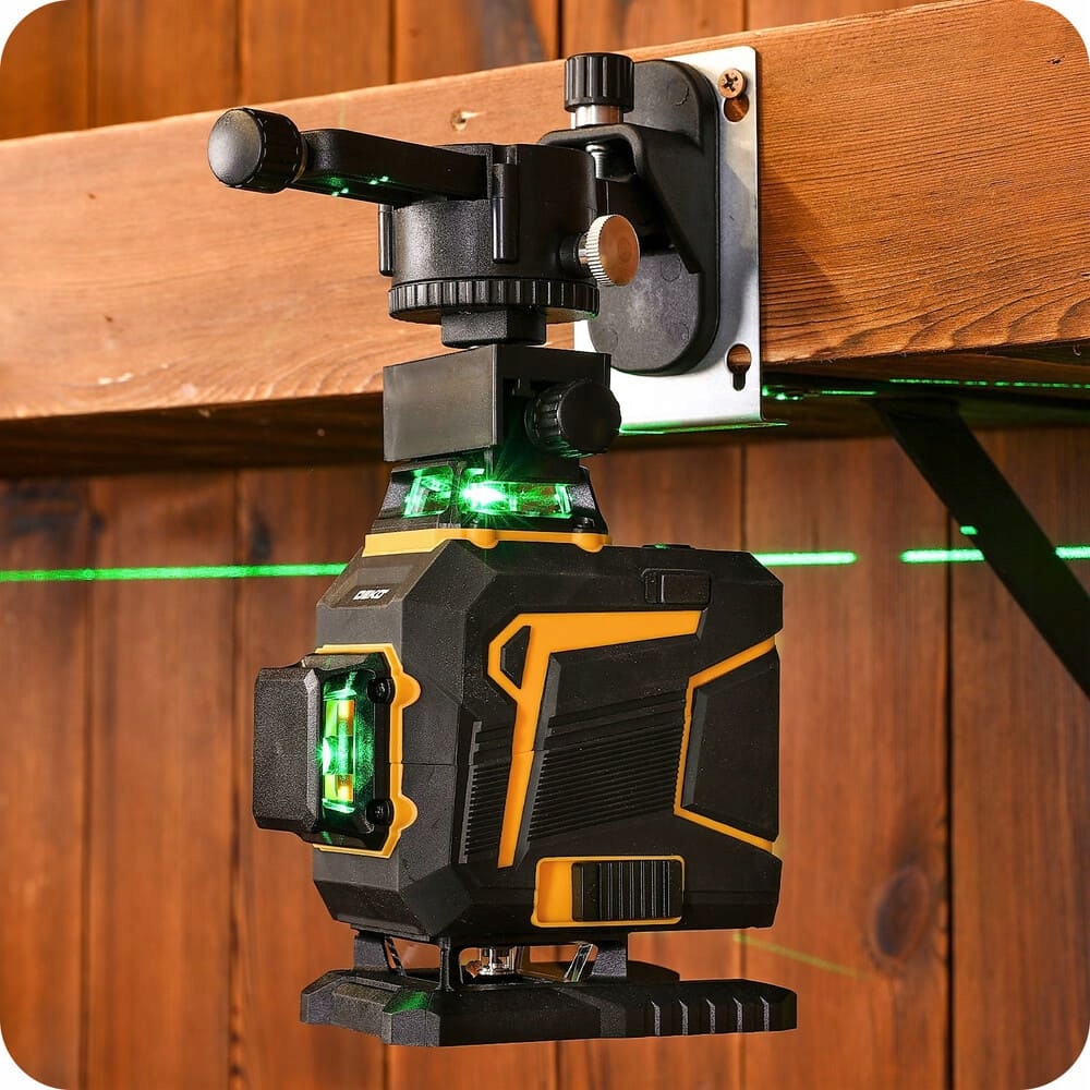 Цей лазер оснащений зеленим променем b>. Він у 4 рази більш видимий, ніж червоний лазер. Це дає можливість проводити вимірювання в більш складних умовах освітлення в приміщенні. При роботі із зеленим лазером око менше втомлюється, оскільки цей колір краще засвоюється очима. Балки самовирівнюються за допомогою магнітного компенсатора з функцією попередження про невирівнювання.