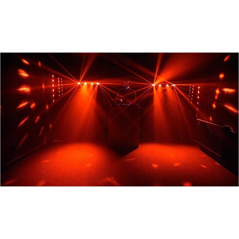 Світловий ефект має бездротовий пульт дистанційного керування, завдяки якому ми можемо легко керувати освітленням. Промінь має два ефекти дербі загальною потужністю 15 Вт, що працюють в палітрі RGBW та дві пари світлодіодних прожекторів. b> загальною потужністю 9 предметів , що працює в кольорах RGB.