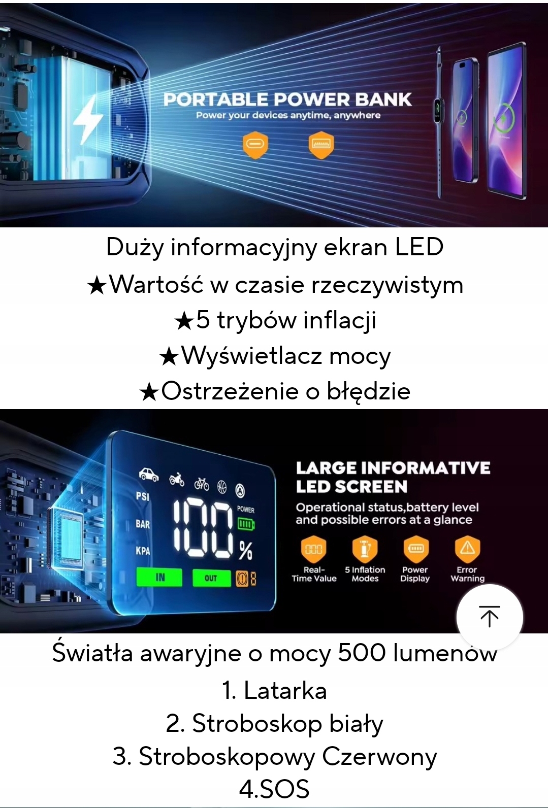 ✅ Пристрій також оснащений ліхтариком Super Bright 400lm(звичайний, стробоскоп, SOS і режими попередження), який забезпечить світло в темряві.