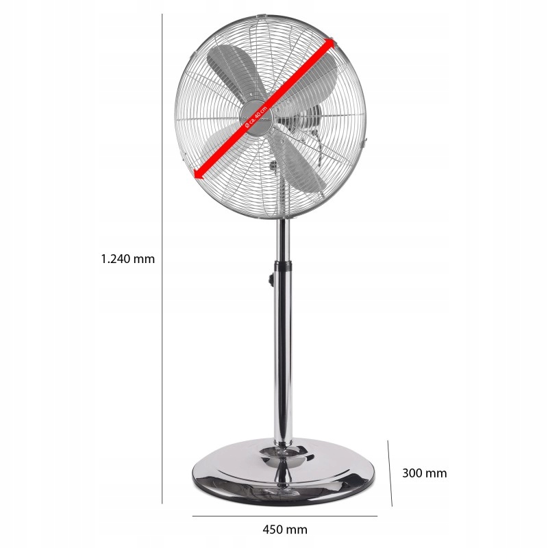 Великий вентилятор діаметром 40 см і максимальною висотою 124 см – це елементи, які ефективно охолоджують повітря. спекотні дні. Стійкий і міцний металевий корпус гарантує довговічність.