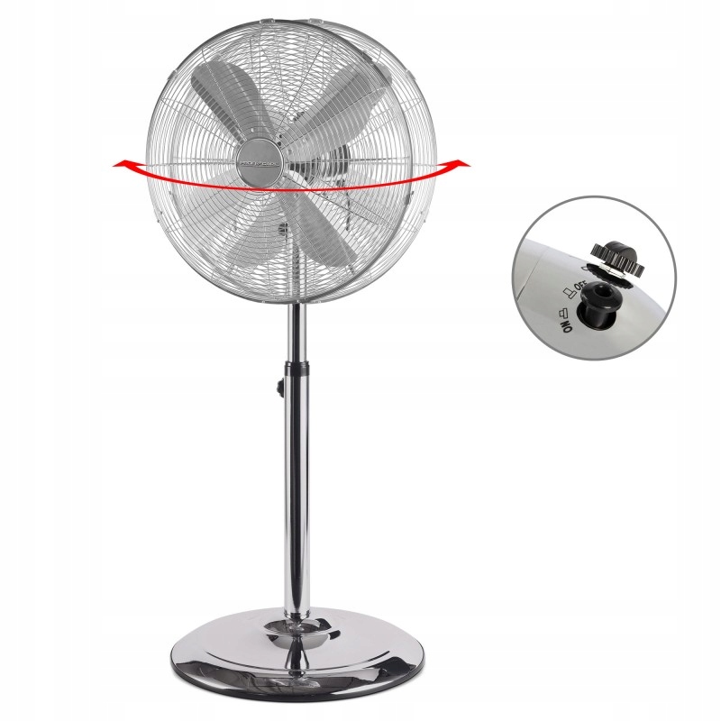 Три рівні потужності, регульований кут нахилу та висота дозволяють легко регулювати прилад. операція відповідно до ваших потреб. Хромований корпус в стилі ретро підходить для приміщень, оформлених в будь-якому стилі. Вентилятор має функцію коливання, завдяки якій він може обертатися для охолодження більшої поверхні.