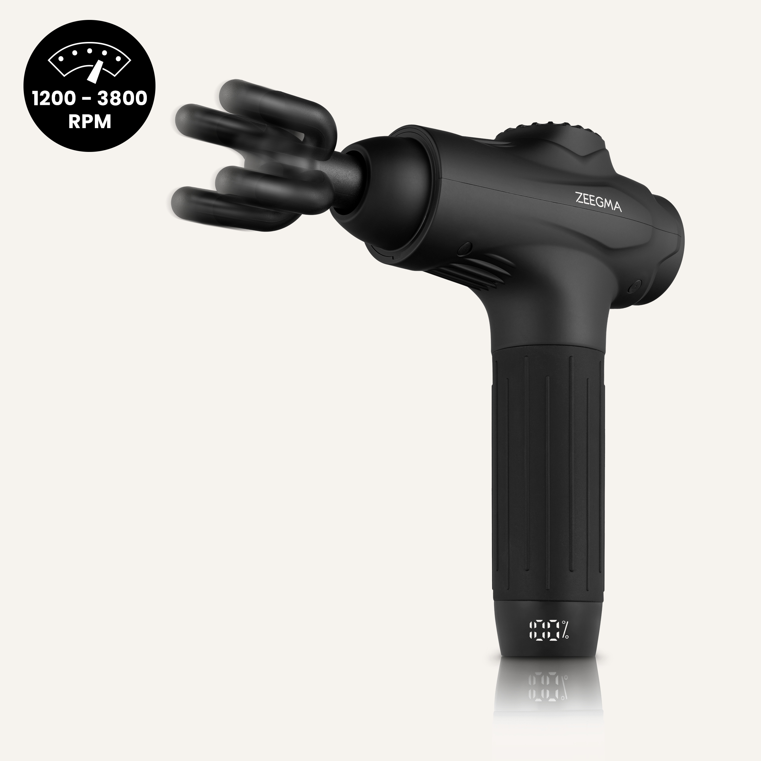 Масажний пістолет працює в діапазоні від 1200 до максимум 3800 обертів на хвилину та має захист від надто інтенсивного використання .
