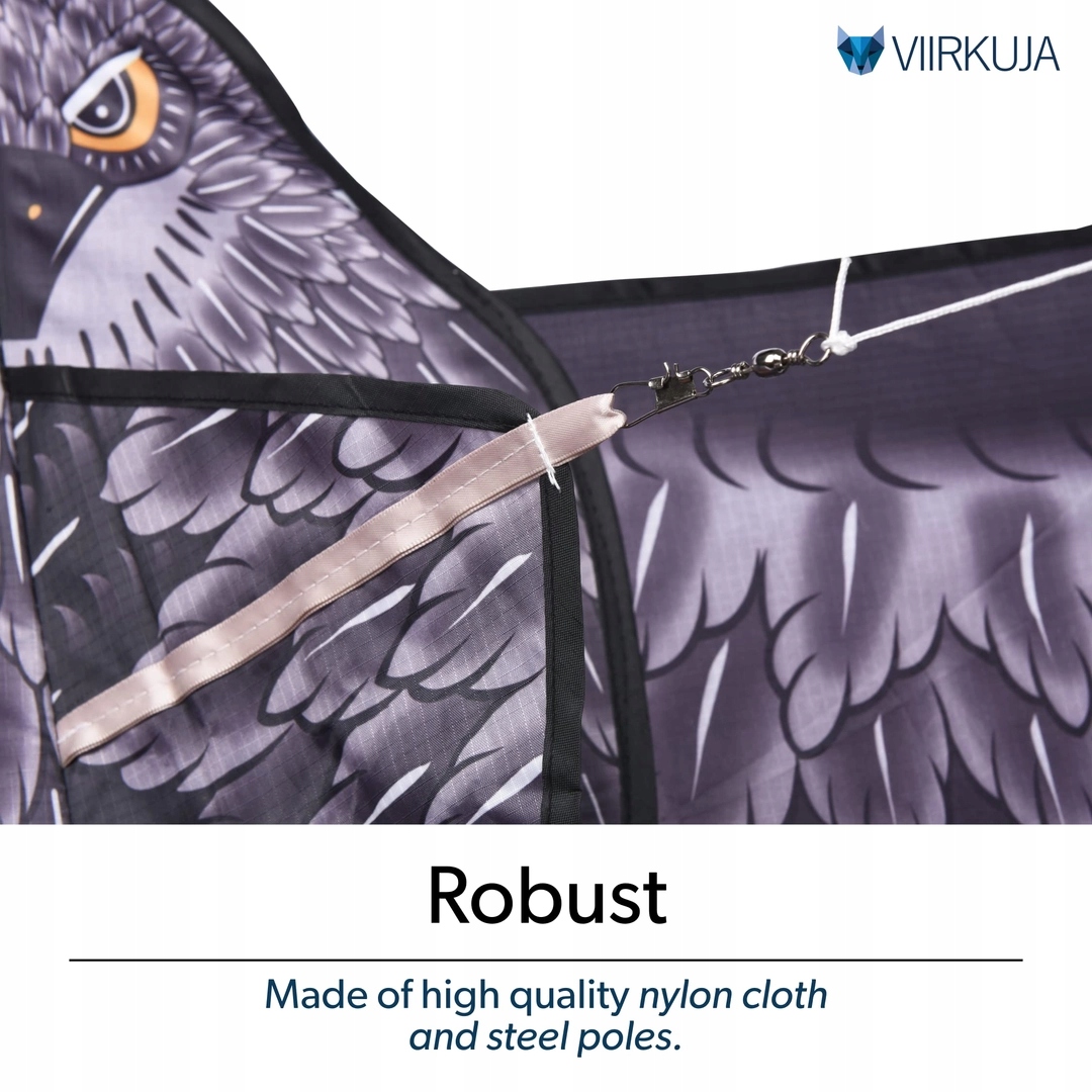 Принцип дії та основні переваги: простий і швидкий монтаж системи, безпосередній монтаж в землю на кілок займає близько 10 хвилин, також можливий монтаж на фасадах або даху будівлі, після установки працює автоматично, без додаткових витрат і обслуговування від власника, висока ефективність проти всіх інвазійних птахів, що зустрічаються в Польщі (шпаки, польові польові, чайки, крячки, галки, горобці та ін.) повітряний змій злітає в повітря при швидкості вітру 2 км/год, модель піднімається нерівномірно, що заважає птахам звикнути до його присутності, ідеально відображає політ хижака під час полювання, за допомогою специфічних рухів крилами, один відлякувач ефективно працює на площі 1-2 га в залежності від висоти і видимості, розміщення в місці, захищеному від високих будівель, може знизити ефективність роботи, відлякувачі повністю екологічні, не вимагають догляду та не турбують сусідів, як звукові відлякувачі чи відлякувачі тріску, а також є додатковою прикрасою саду,