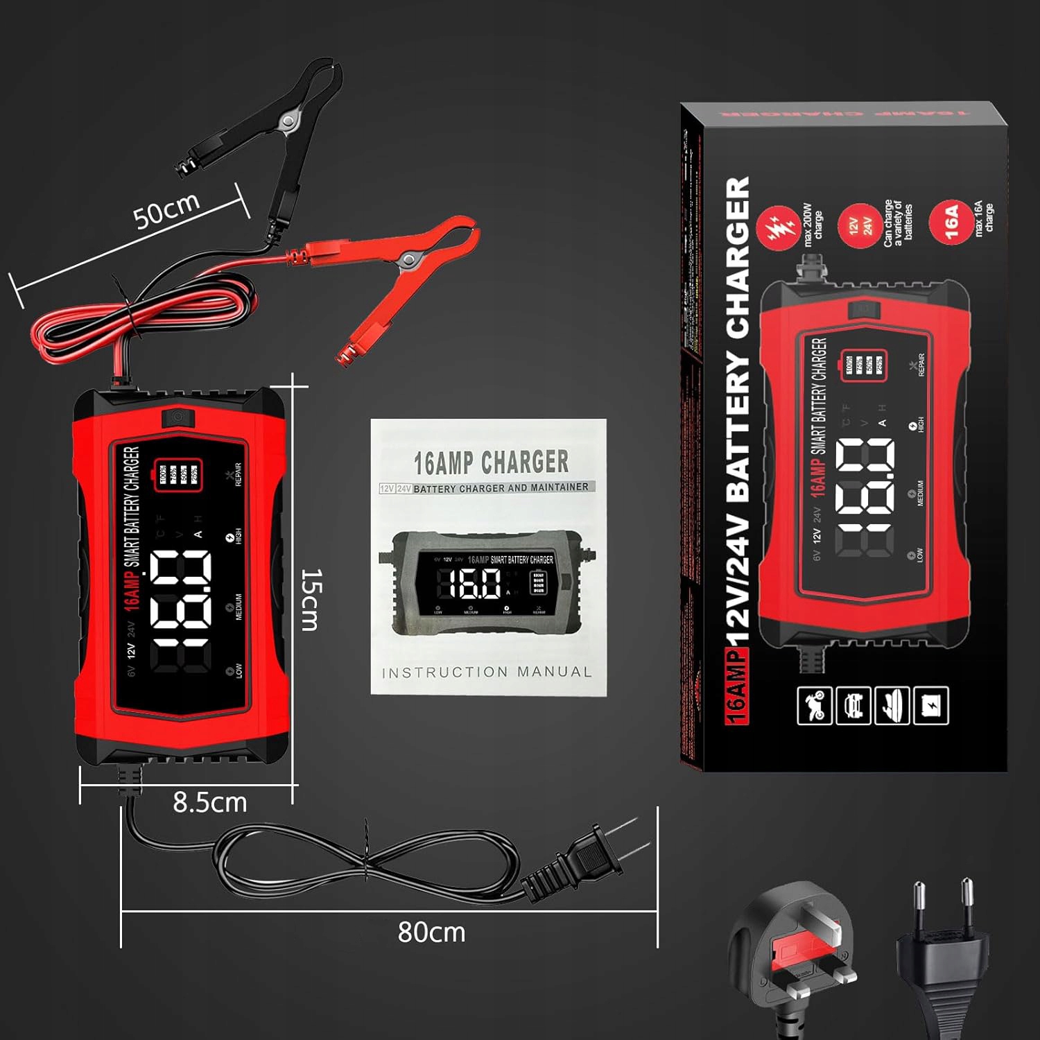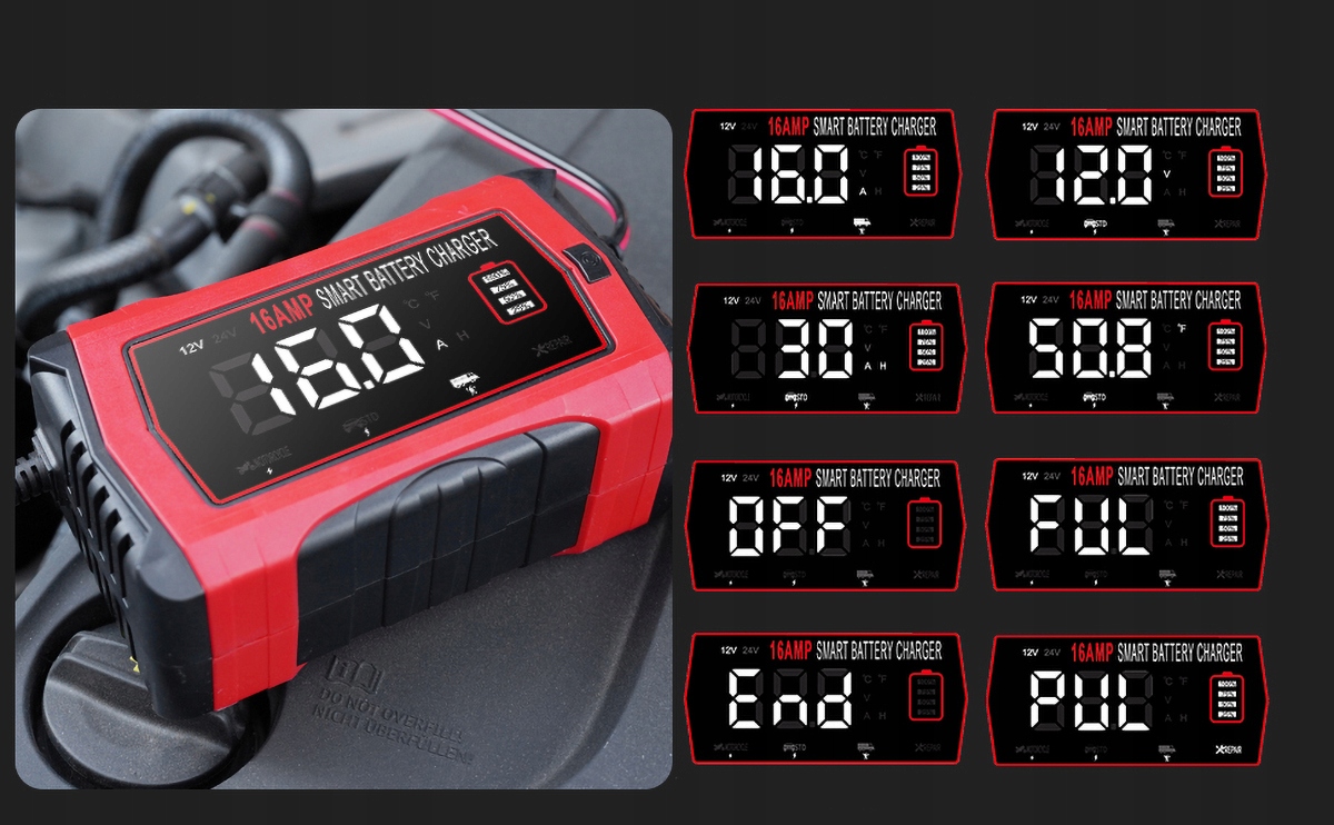 【Зарядний пристрій для автомобільного акумулятора на 16 А】 Цей зарядний пристрій для автомобільного акумулятора підходить лише для свинцево-кислотних акумуляторів 6 В/5 А, 12 В/16 А та 24 В/10 А (AGM, кальцієвих, гелевих, MF, EFB, SLA, VRLA, вологих), літієвих акумуляторів і акумуляторів LiFePo4. Він широко використовується для безпечного й ефективного заряджання автомобілів, мотоциклів, човнів, газонокосарок тощо.