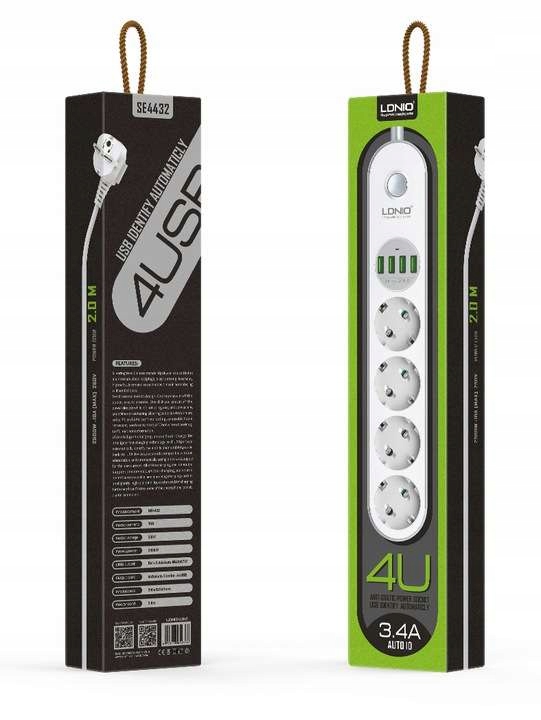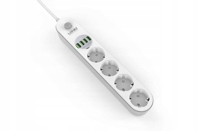 ldno se4432 - надійна смуга живлення завдяки якому ми можемо одночасно підключити 8 пристроїв. Чотири пристрої підключені до стандартних струму, додаткові чотири до USB -порти, які мають автоматичне регулювання струму до підключеного максимуму до 3.4a.