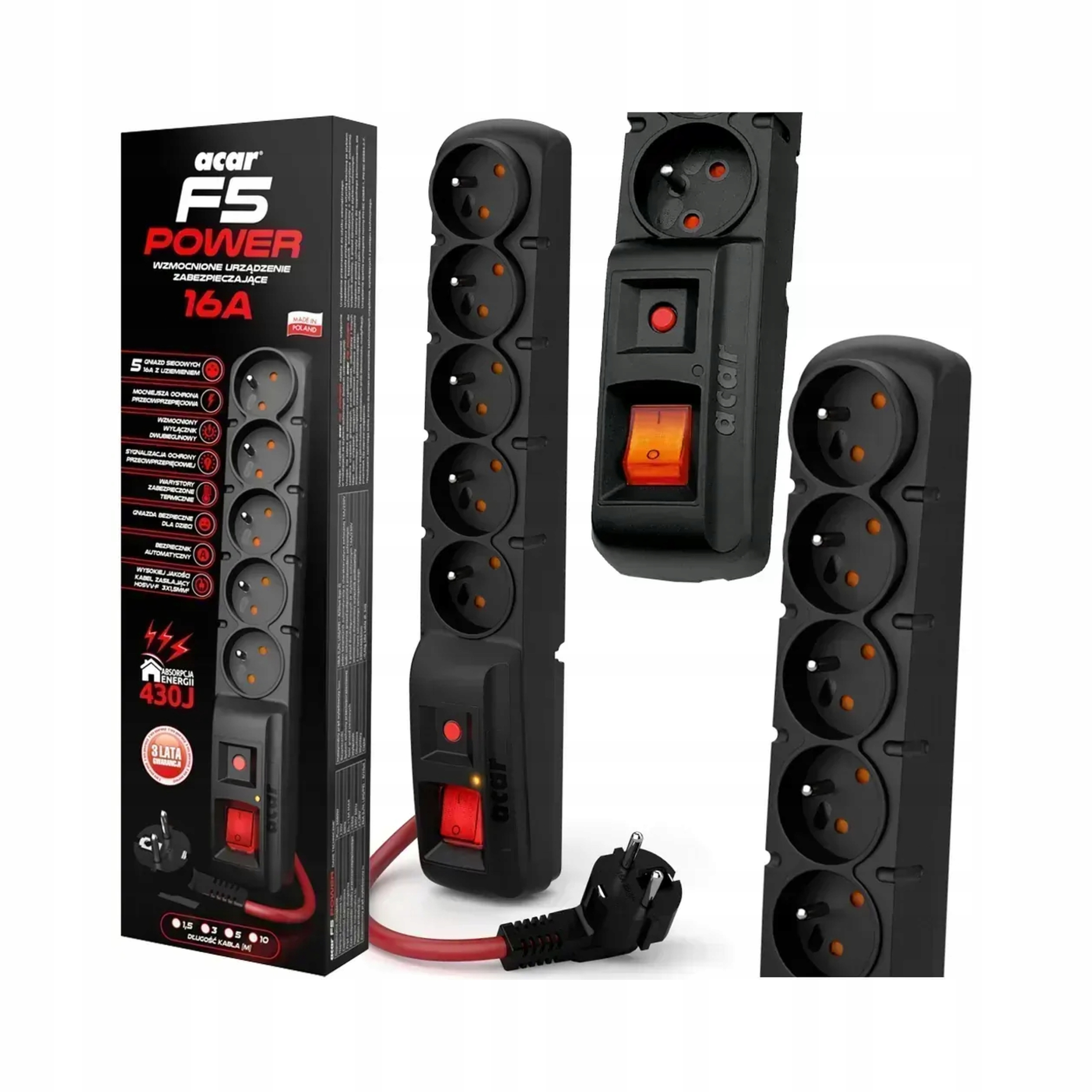ACAR F5 Power-це 16-амп, підсилена версія найпопулярніший пристрій безпеки з родини ACAR. З довжиною менше 33 см, він дає п’ять мережевих розетків із заземленням . Ця сума в більшості додатків є достатньою, і порівняно невеликі розміри дозволяють розміщувати його навіть на столі безкоштовно. Він використовує армований мережевий перемикач , стійкий до великих ударів струму, що виникають, наприклад при перемиканні комп'ютерних джерел живлення (настільні та ноутбуки). Побудований у пристрої армованою анти -регедіальною системою захисту забезпечує захист усіх ліній електропередач і розряджає енергію хірургії Землі за допомогою захисного кабелю PE. Пристрій має індикатор правильності системи захисту від перенапруг. кріплення ручок - стандартне обладнання пристрою.