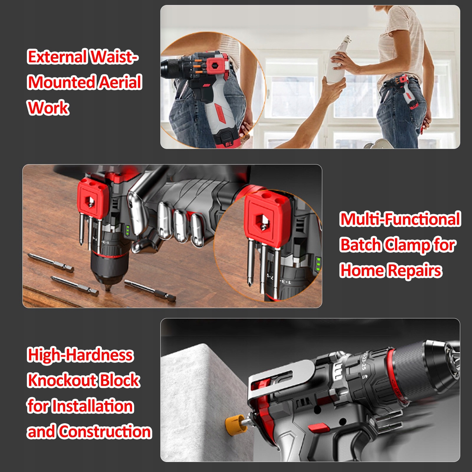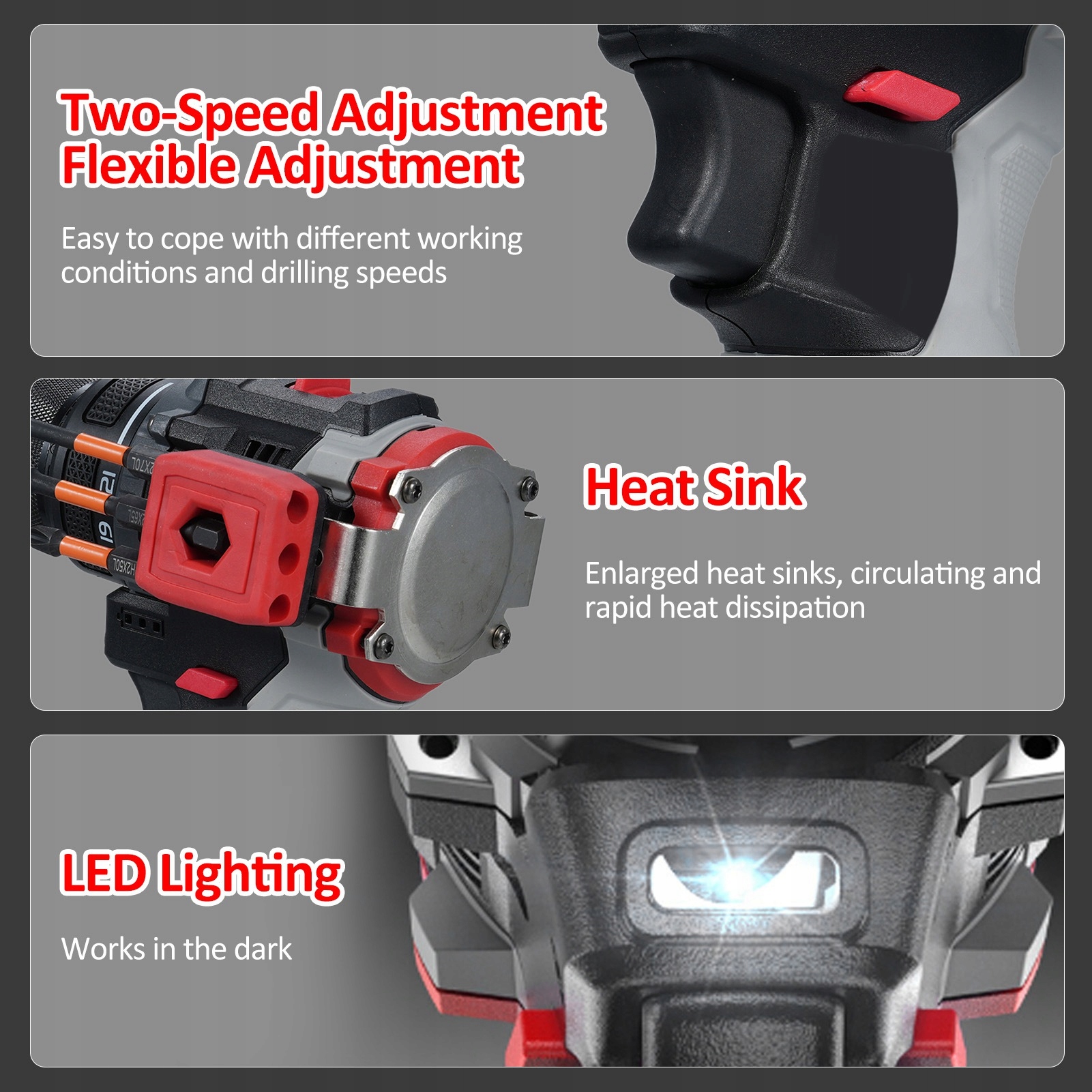 4. 【Літієве свердло】Для свердління в дереві, металі та пластику, а ви можете використовувати тригер зі змінною швидкістю прямого та зворотного ходу, щоб легко контролювати швидкість свердління та зворотні свердла.