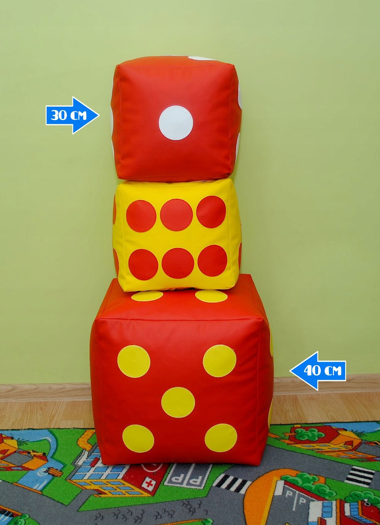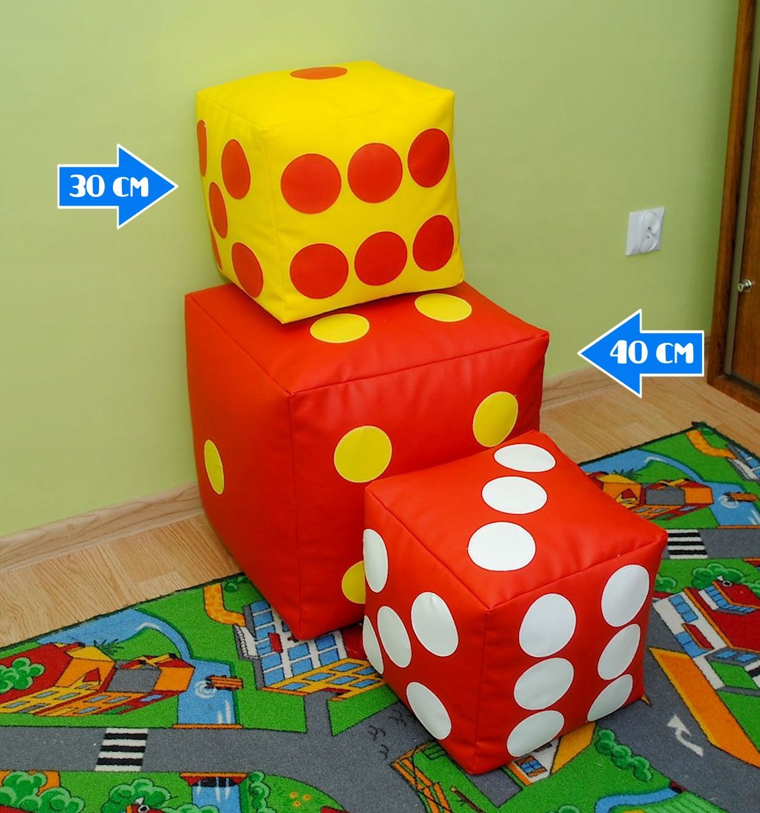 Наші кубики мають багато додатків - ви можете сидіти на них, вони також чудові як підніжки. Вони ідеальні як елемент декору кімнати, вітальні, балконів або консерваторії. Дуже низька вага та використання відповідних матеріалів Забезпечення зручності у користуванні наймолодшим.
