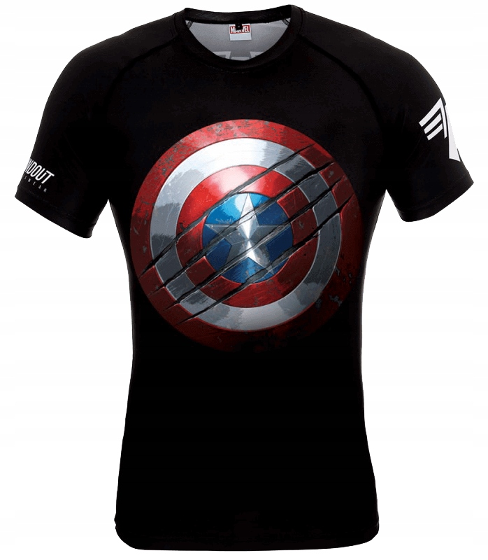 Rashguard має гнучкий, плоскі шви, що запобігають потертості і не подразнюють шкіру. Футболка прикрашена привабливими, міцними і незмивними принтами, виконаними методом сублімації: знаменитий щит Капітана Америки на грудях, а також логотипи «A» і Poundout на спині і рукавах. Ідеальна модель для фанатів Месників!