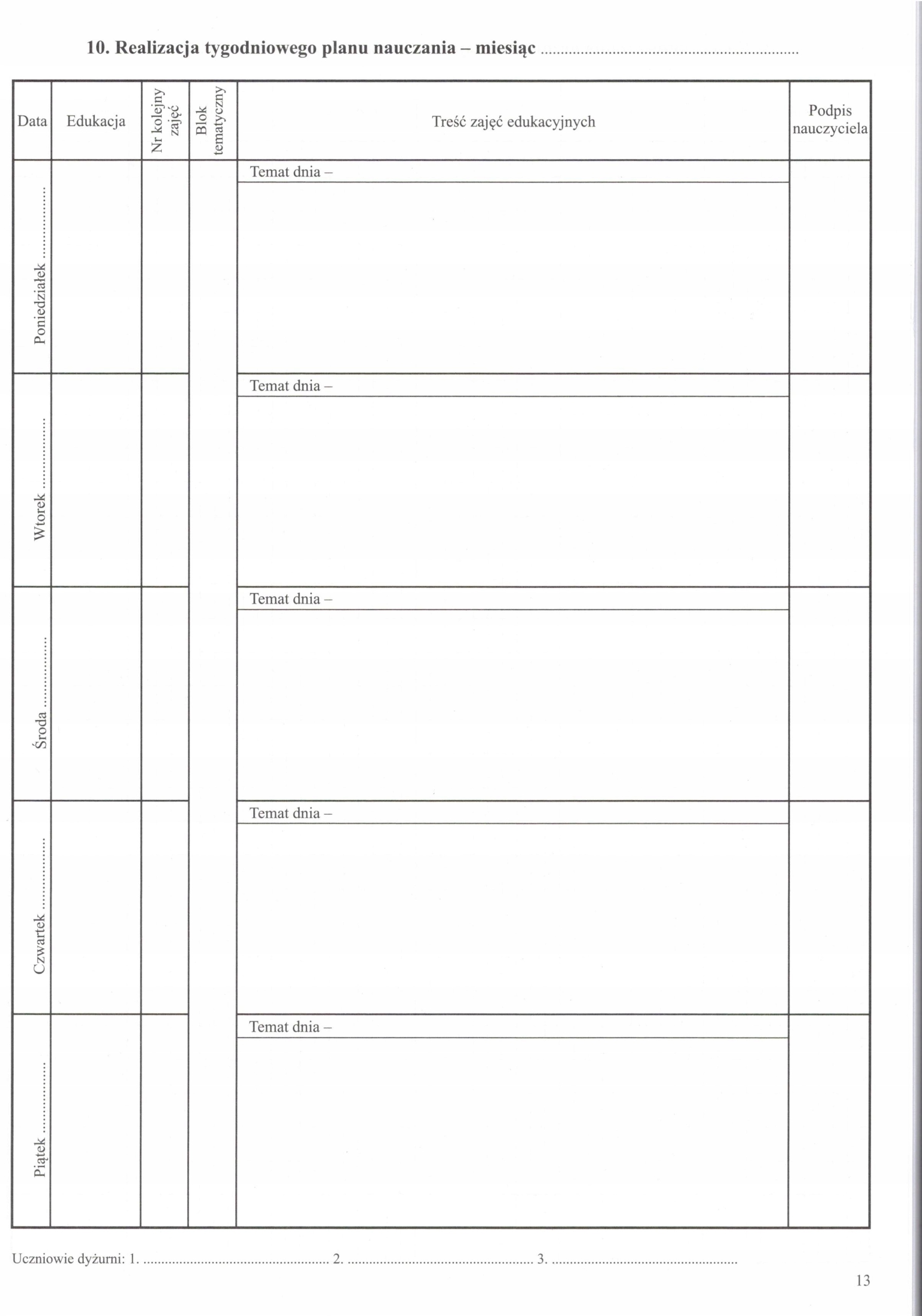 10. Виконання тижневого плану навчання – місяць .....