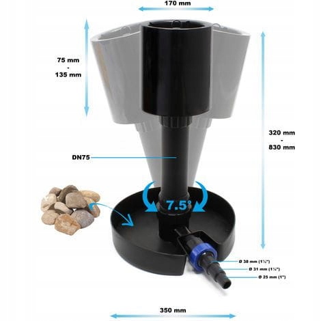 Телескопічна труба дозволяє регулювати висоту скиммера, а поплавок автоматично підлаштовує її під поточний рівень поверхні води. Поплавок регулюється автоматично до 10 см. Рухоме з’єднання дозволяє регулювати фільтр на злегка нерівних поверхнях.