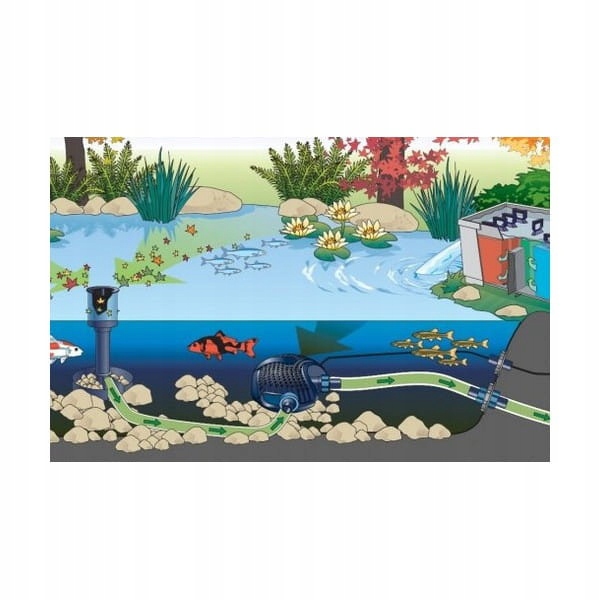Для живлення скиммера необхідний будь-який насос продуктивністю 8000-16000 л/год. Відповідне навантаження (наприклад, каміння, гравій близько 10 кг) забезпечує належну стійкість скімера. Просто підключіть скімерний фільтр до насоса у вашому ставку.