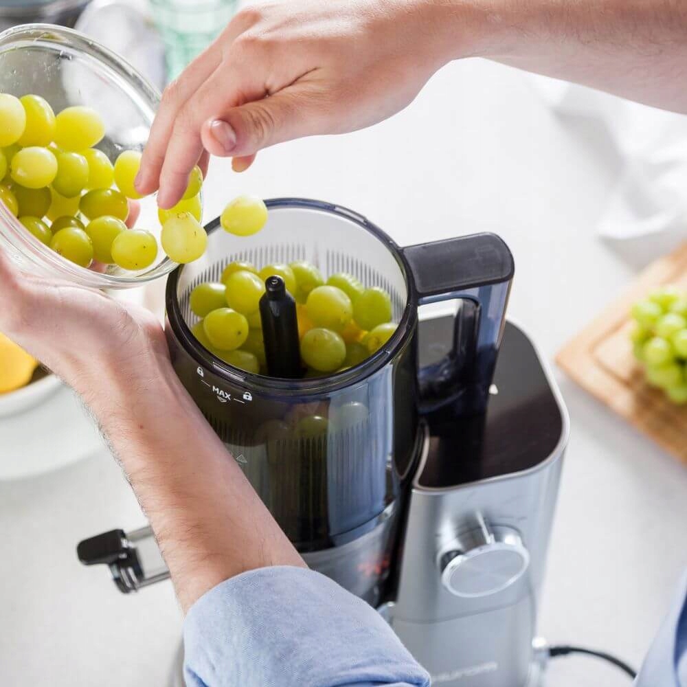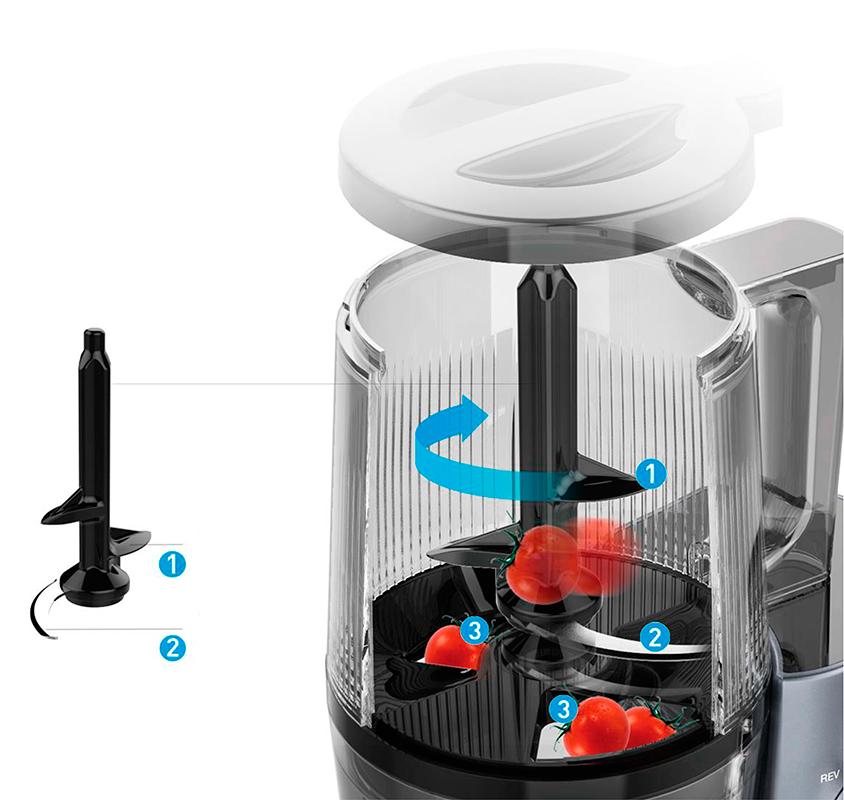Вертикальна конструкція чаші полегшує падіння м’якоті, а нахил 3 градуси дозволяє збирати сік до останньої краплі.