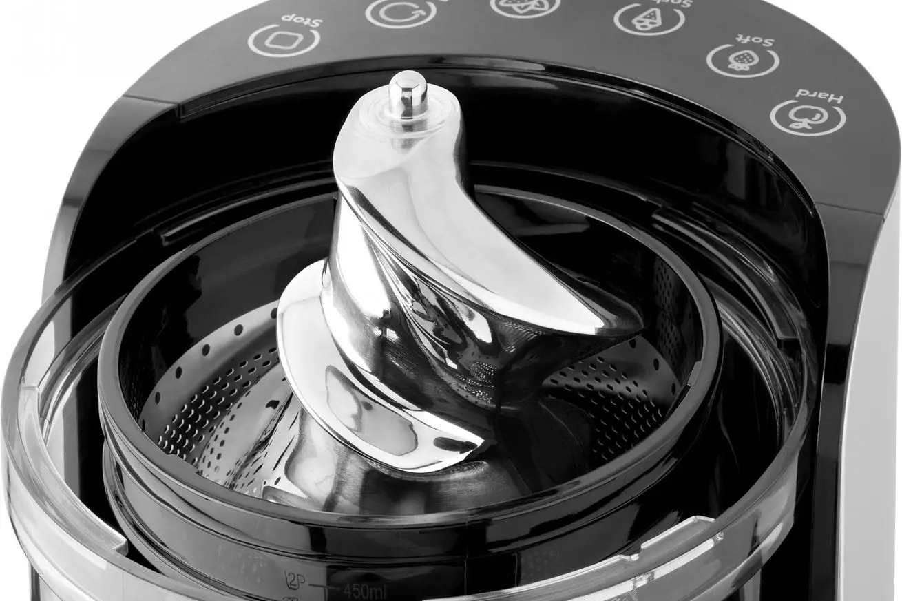 Ви можете вибрати з 4 попередньо встановлених режимів відповідно до сировини та трьох сталевих ситечок відповідно до необхідного результату - від свіжого соку, смузі з високим вмістом клітковини до морозива.