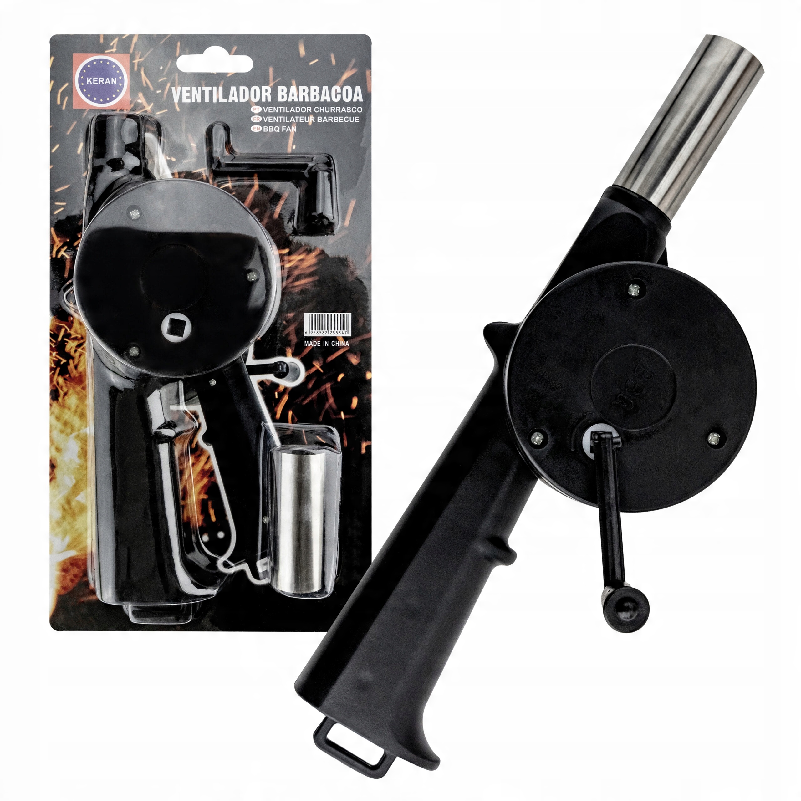 Повітродувка працює за допомогою ручної рукоятки, яка вдуває повітря в піч і прискорює процес горіння, що дозволяє отримати відповідну температуру. Ручне керування нагнітачем дозволяє контролювати інтенсивність удару, що дає користувачеві повний контроль над процесом розпалювання. Ергономічна ручка забезпечує зручне та надійне захоплення, а легка конструкція дозволяє зручно переносити повітродувку в будь-яке місце.