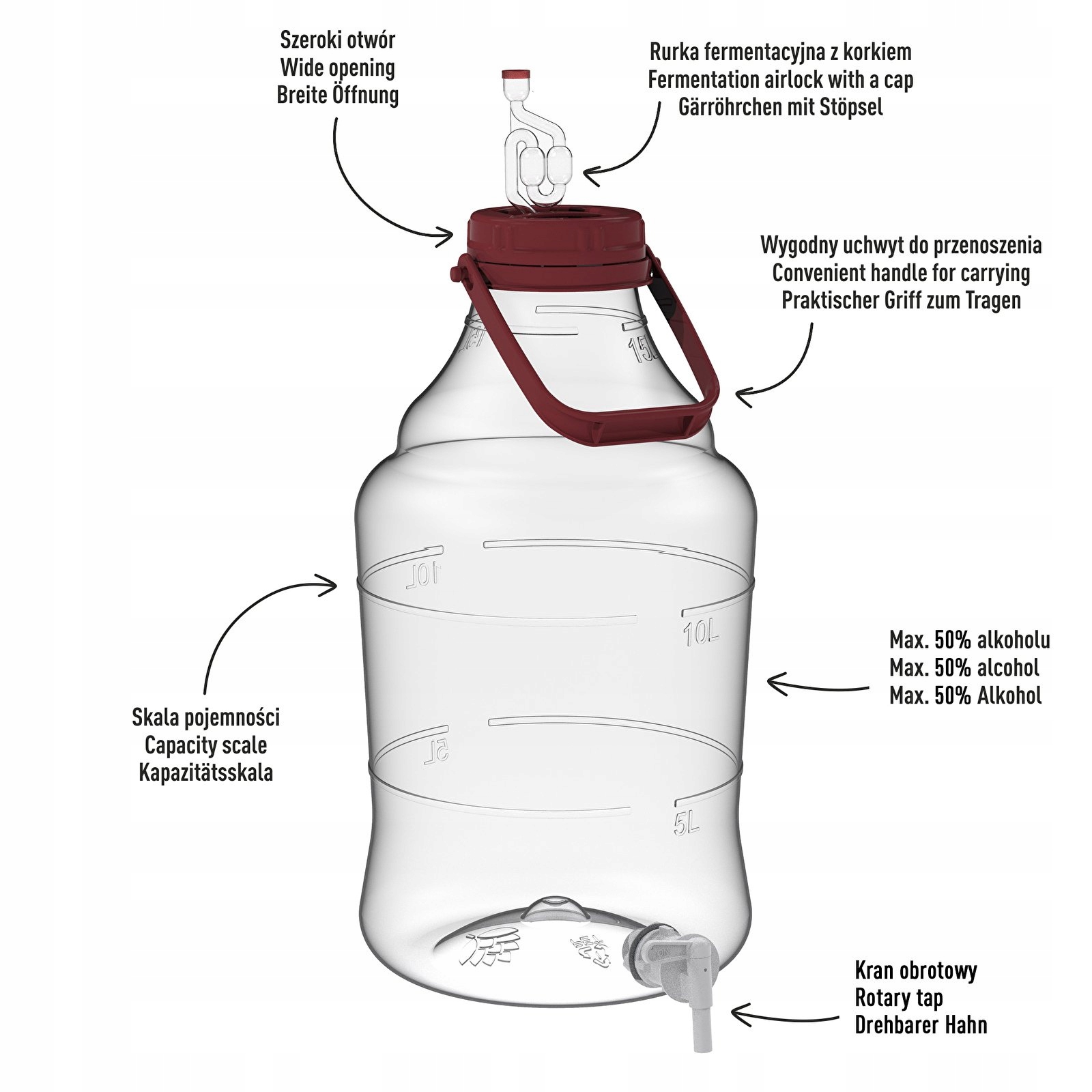 Революційний продукт, ідеальний як для початківців, так і для досвідчених виноробів і пивоварів. Легка небитка повітряна куля об'ємом 15 л виготовлена з небиткого матеріалу, призначеного для контакту з їжею. Це інвестиція на роки та ідеальна заміна традиційним скляним кулькам. Посудина оснащена зручною ручкою, яка ідеально лежить в руці і дозволяє легко переносити навіть повну важку повітряну кулю. Додатковою перевагою продукту є спеціально розроблений зливний кран, що обертається, що полегшує зливання осаду. Наповнення повітряної кулі полегшується завдяки шкалі на прозорому матеріалі, яка дозволяє перевірити наповнену кількість. Дослідження підтверджують можливість безпечного контакту балона зі спиртом до 50%.